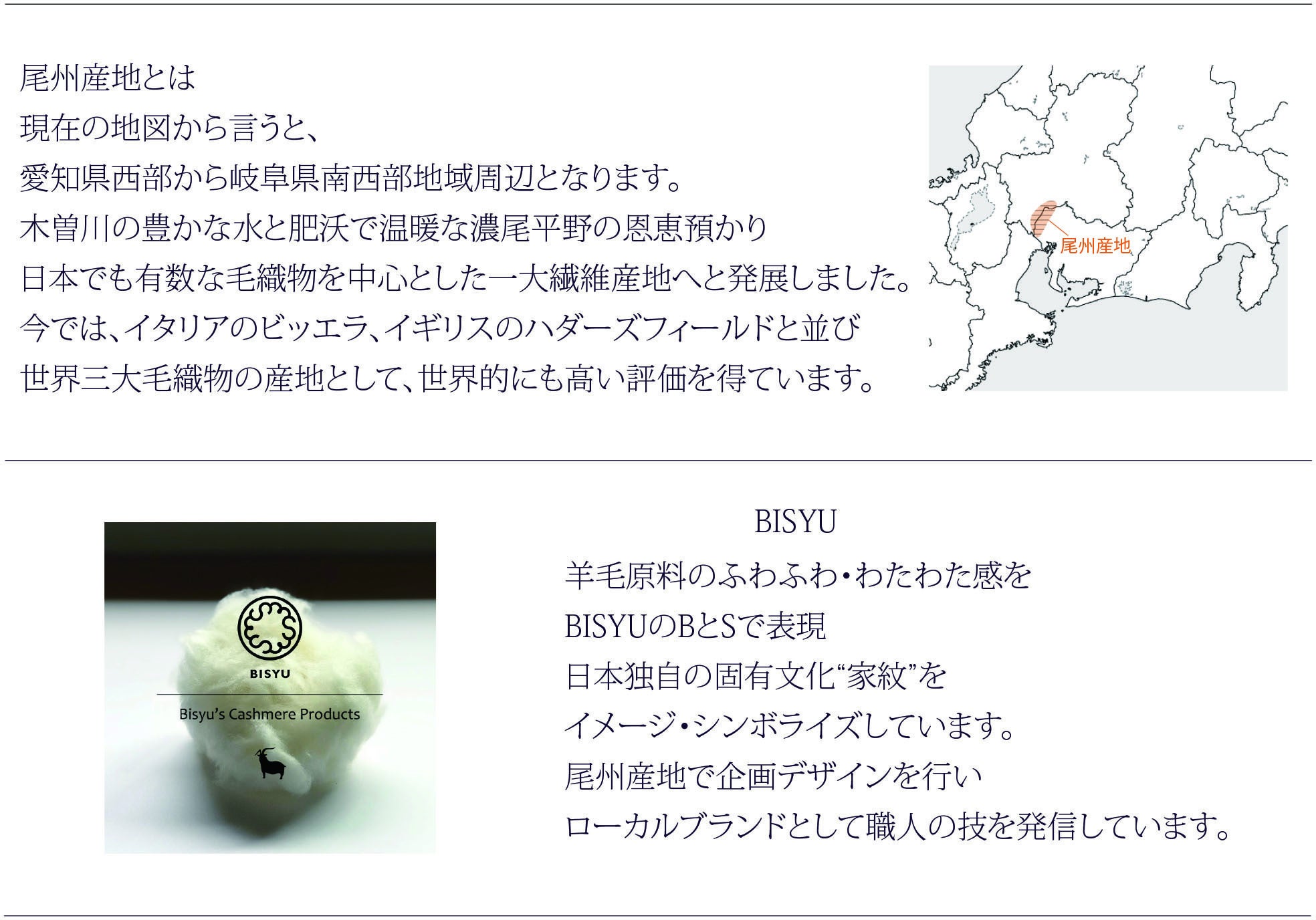 Bisyu’s - Products.は地元『尾州産地』にて、たくさんの職人さんたちに囲まれた素晴らしい環境の中、原料、糸の選別から素材・生産地にこだわりものづくりをしております。