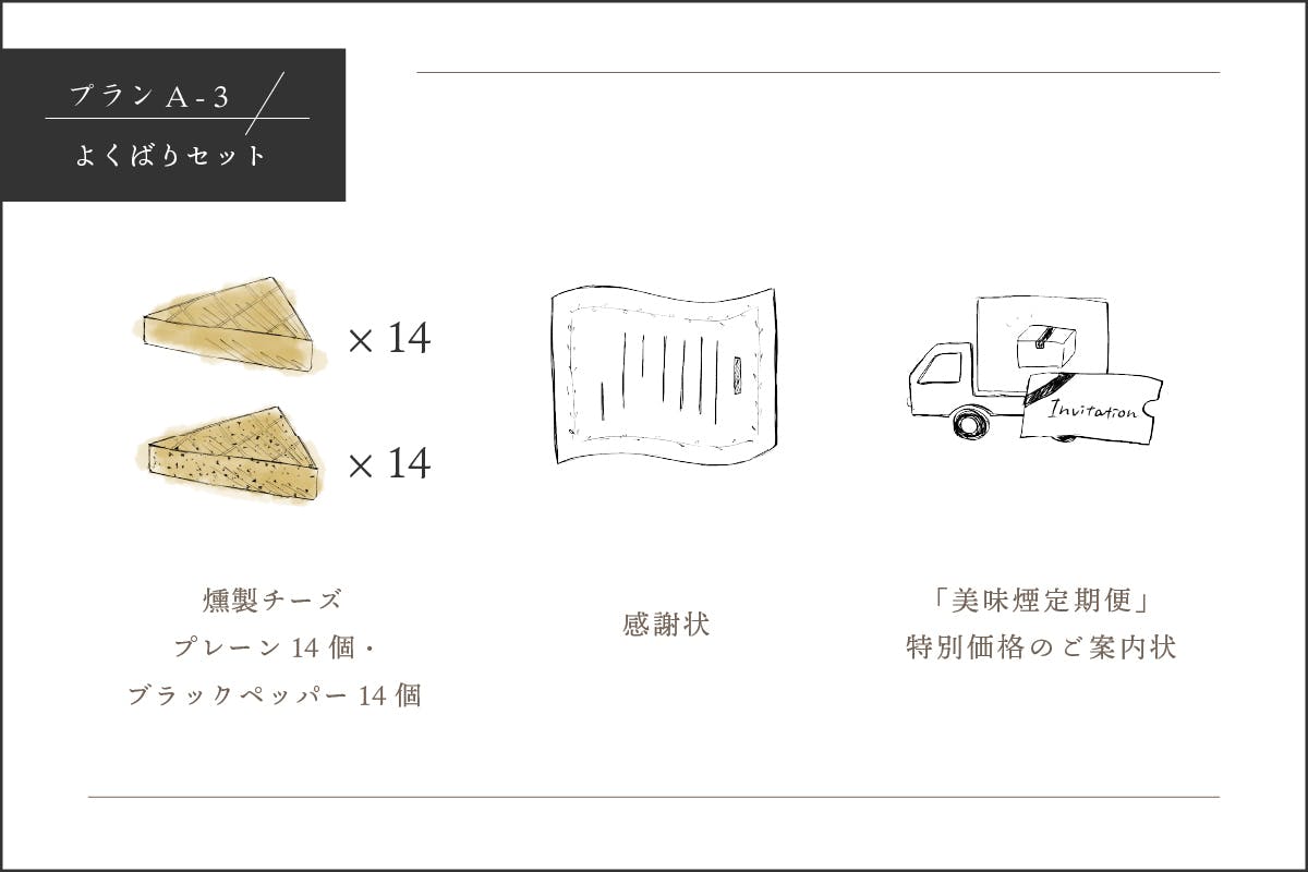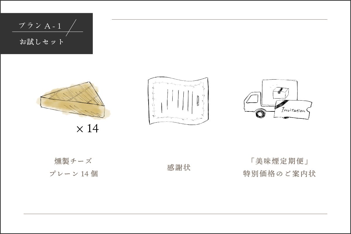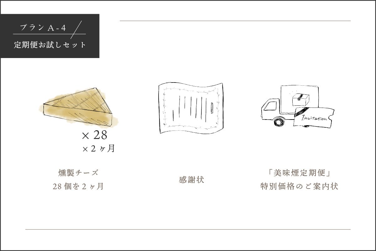 A-4.定期便お試しセット … 燻製チーズ28個が毎月届く「美味煙定期便」の2ヶ月お試しのセットです。感謝状、「美味煙定期便」の特別価格でのご案内状も入っています。20,000円のプランです。
