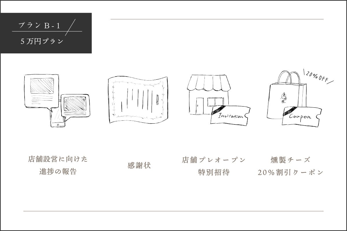 B-1.5万円ご支援プラン … 設営の進捗報告、感謝状、店舗プレオープン招待、燻製チーズの20%割引クーポンが入った、50,000円のプランです。