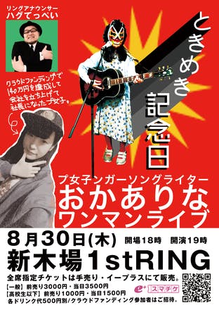 2018/02/28 15:03クラウドファンディングにご協力いただき、ありがとうございました! 80万円達成の公約として掲げていた「ワンマンライブ」の開催が決定しました! 私の未来に投資をしてくださった全パトロン様は私からのささやかなお礼として、公約通りワンマンライブにご招待となります! 気になる会場は、なんと、、!「新木場1stRING」です!!! あの!!インディプロレス団体の聖地!!会場にはリングが常設されているので、おかありな念願のリングがステージでのライブとなります!! キャパは200超!!ひえ!!!!!完売目指して駆け抜けると、腹をくくりました!!がんばる!!史上最大規模のワンマンライブ!!! 日にちは8/30!!!!そしてなんと!!!リングアナウンサーとして、普段からお世話になりまくっている渋谷gee-geのハグてっぺいさんが出演してくださいます!!!! 私はプロレスがガチで好きすぎて、あまりそれを言わずに活動してたんですけど、てっぺいさんが私のプロレスの話を聞いてくださって「本気で好きじゃん!じゃあもっと胸を張って言うべきだよ!!!」とおっしゃってくださって今の私が御座います、、、!!! 口に出したから、リングで歌いたいって夢も8月に叶うことになりました!すごい! 実は上京してからはじめてのワンマンライブです!最高に最高な1日にするので、ぜひ皆様、予定を合わせていただけると嬉しいです!!!!よろしくお願いします!!!!!!! ーーーーーーーーーーーーーーーーーーー8月30日 新木場1stRINGおかありなレコ発ワンマンライブ「ときめき記念日」開催決定 リング常設プロレス会場でワンマンライブを開催!リングで歌う夢が叶う日! チケットの一般発売はイープラスにて明日朝10時より開始! 【イープラス】http://sort.eplus.jp/sys/T1U14P0010843P006001P002252962P0030001 もっと見る本日最終日!120万円達成!