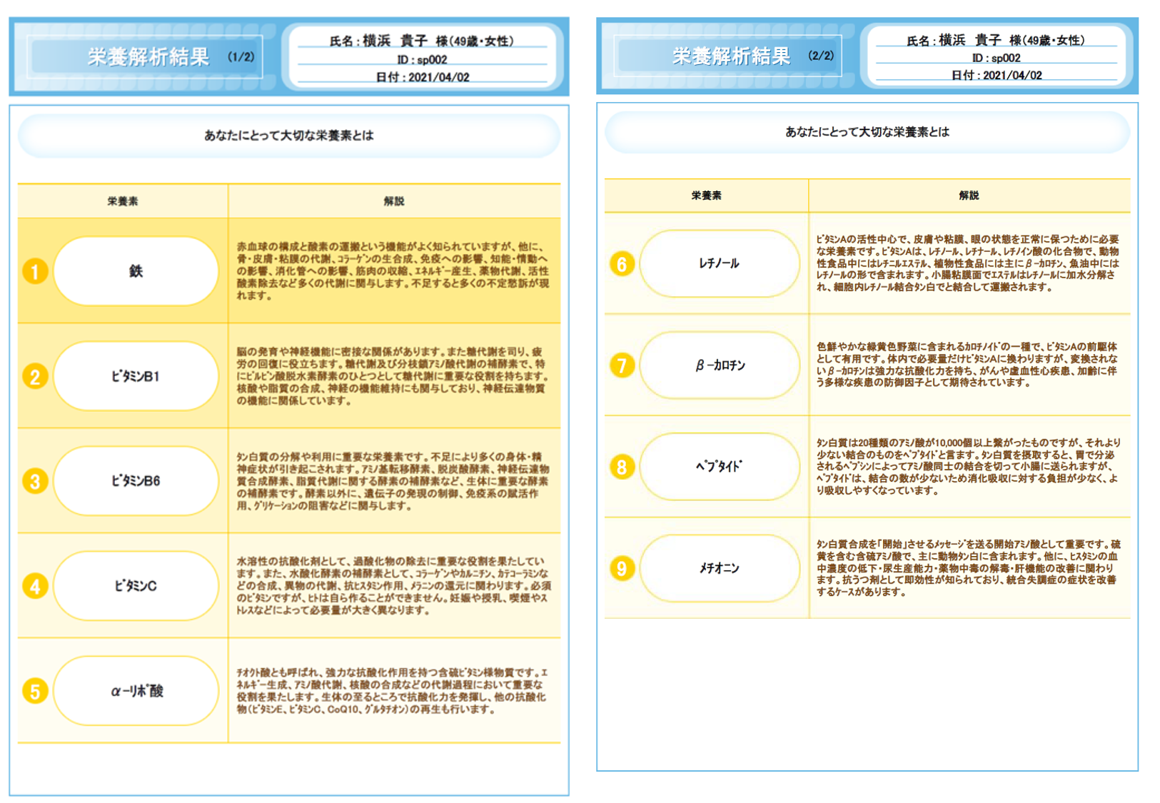 さまざまな体の不調を栄養の面から調べる検査です。採血の結果から、不足している栄養素をはじめ、消化吸収能力や炎症など、栄養の代謝に焦点を当てて調べることができます。本当に必要としている栄養素と普段の食事の工夫点について有資格者によるカウンセリングがつきます。(以下、デモ画面)