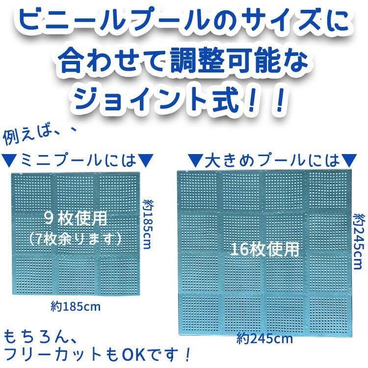 一枚一枚が正方形の作りになっており、下記画像の様に4枚x4枚でジョイントすれば約3畳分の広さになります。お好みに合わせて色々組み合わせが出来ますので、玄関からプールまでの通り道の様に設置したり、小さいプールであれば4枚だけ敷いたりと自由に形を変える事が出来ます。