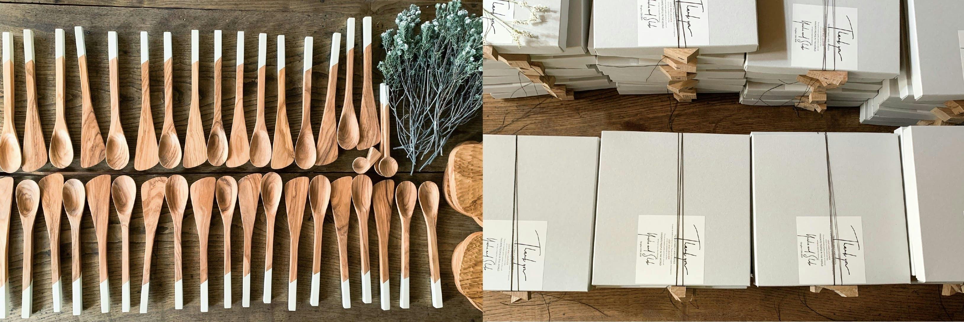 ヒノキの天然木を一枚板から切り出し、削ったり擦ったりしながらひとつひとつ手で作っています。日々木クズの舞うアトリエで製作しています。