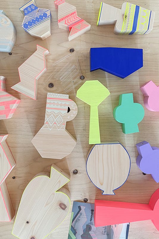 木が持つ天然の美しさと工業的なイメージのネオンカラーを使って人の手で施された柄や、モダンな形状のコントラストが楽しい作品です。