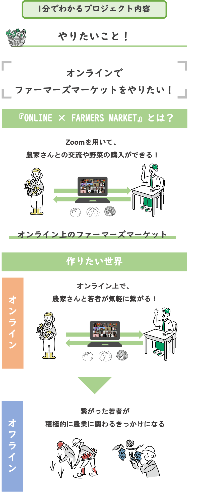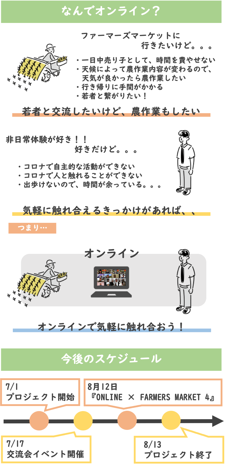 「私が何か力になれることはないか?」と思い、まずは人手不足の問題を改善するために「農業を学生の身近なものにしよう!」と考えました。現在は、主な活動である『ONLINE×FARMERS MARKET』を行なっています。