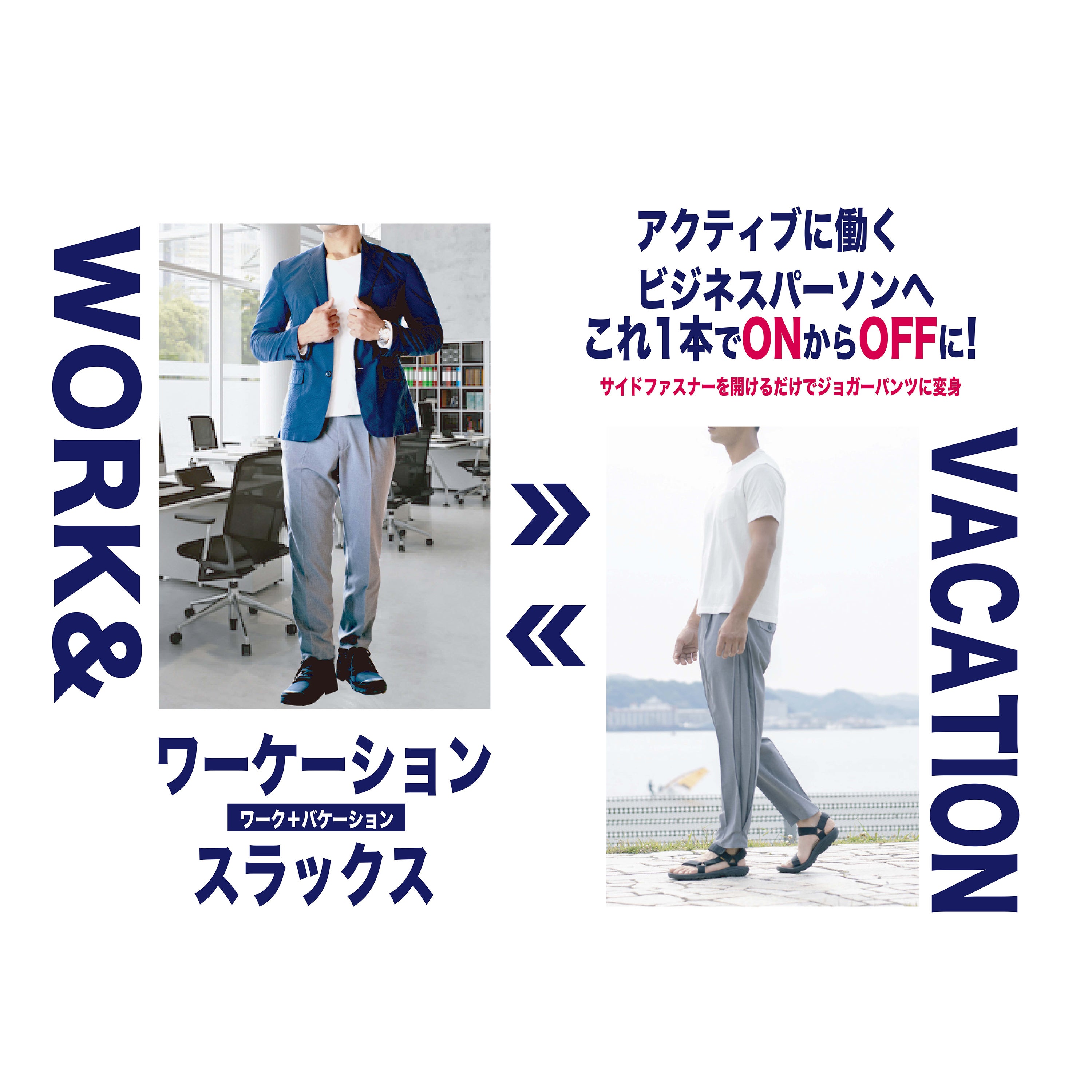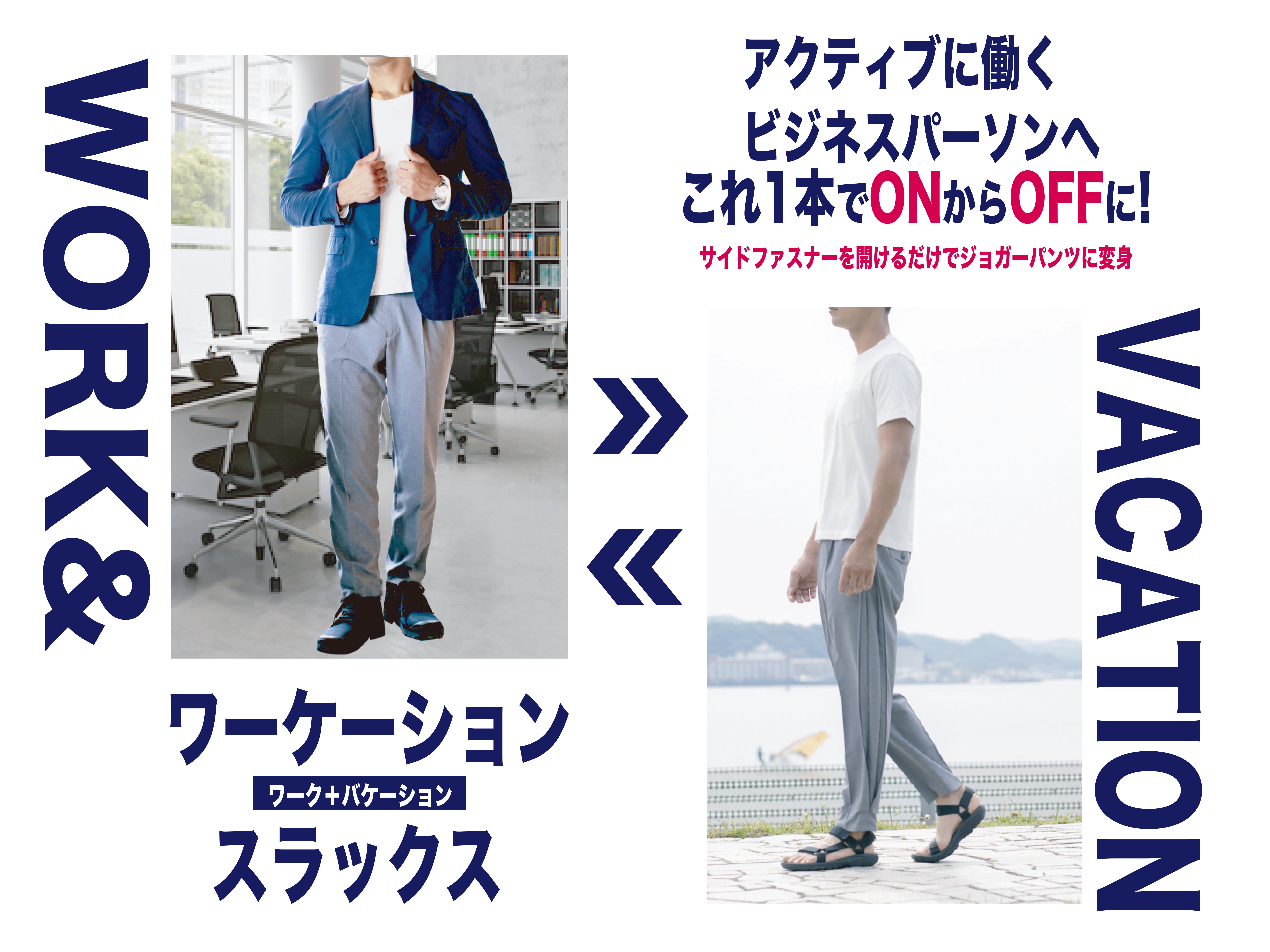 ▼3つのポイント・サイドファスナー開けるだけ!1本でONとOFF2つのシーンに対応したワーケーションパンツ決定版