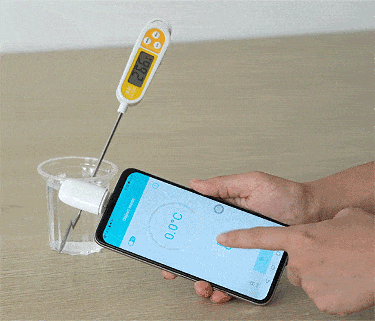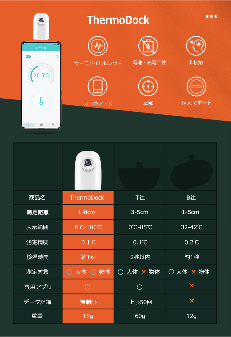 「ThermoDock」は、スマートフォンのコネクターに接続するだけで物体の表面温度を測定できる、非接触式スマート温度計です。