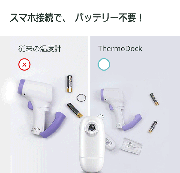 「ThermoDock」にはバッテリーが搭載されておらずスマートフォンに接続して使うので、充電も電池交換も必要ありません。スマホさえあればいつでもどこでも測定できます。