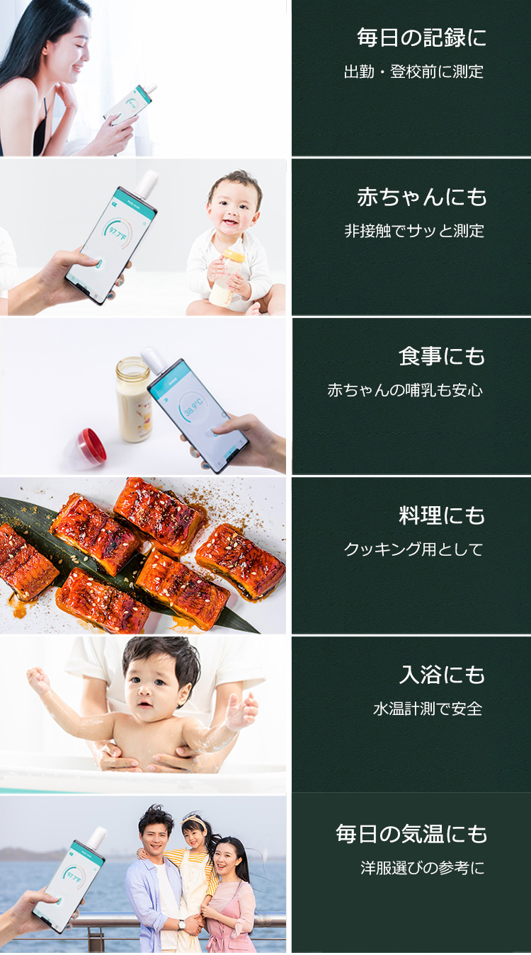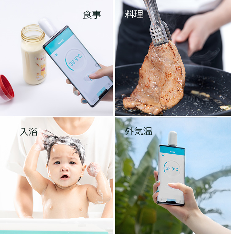 赤ちゃんの哺乳や離乳食の温度チェック、入浴時の水温チェックなど、思いついたときにサッと測れるので、日常のさまざまな場面で大活躍します。