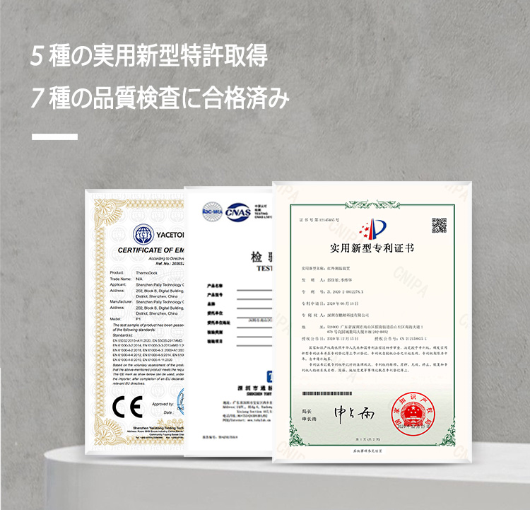 確かな品質の確保と皆さまの安心を守るため、機能検査や品質検査など7種の品質検査に合格しています。また、「赤外線検温」など5つの実用新型特許やCEマークを取得しました。ユーザー目線に立った使いやすさと安全性をお約束します。