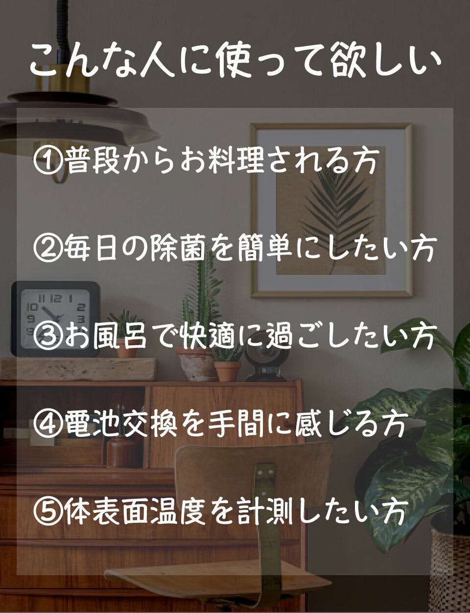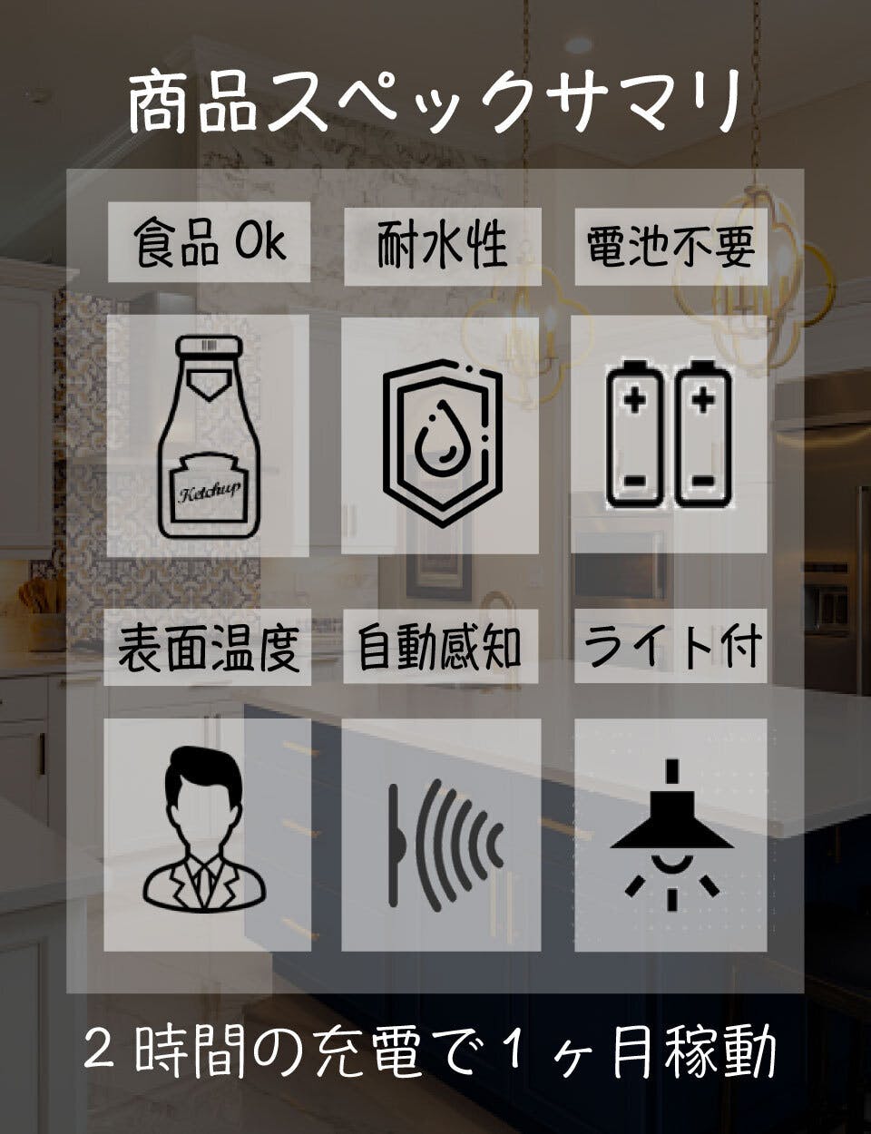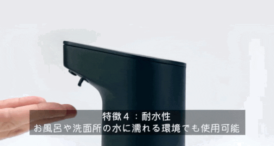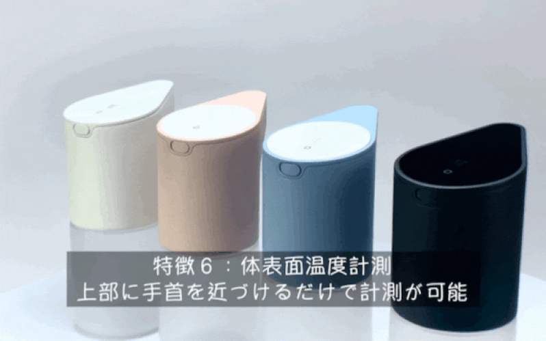 ①液体に合わせてノズルを変更、液体量の変更が6段階で出来、2時間の充電で1ヶ月稼働!②お風呂やキッチン等でも使用できる耐水性があり、1秒で測れる体表面温度計測が付いてる!③自動感知センサーで手を出すと自動で液体を出すだけでなく、ライトも付けることが可能!