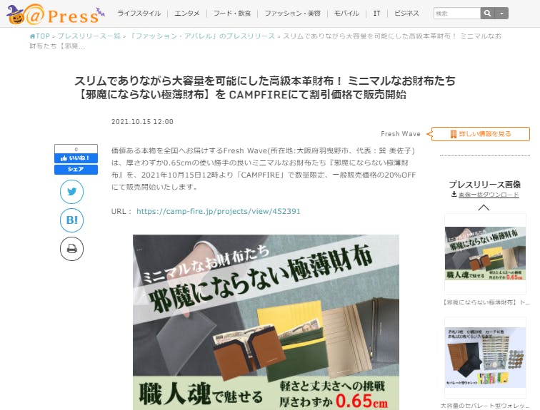 2021/10/18 19:08皆さま、Fresh Waveの巽と申します。いつも応援ありがとうございます。【邪魔にならない極薄財布】厚さわずか0.65cmのミニマルなお財布たち!10月25日に@Pressさんにプレスリリースを掲載していただきました。URL:https://www.atpress.ne.jp/news/279880厚さわずか0.65cmというスリムながら、大容量。オシャレなカラーでポケットに入れても邪魔になりません。今なら、一般販売価格の20%OFFでご購入いただけます。是非この機会に、ご支援いただけると幸いでございます。引き続き、SNSでのシェア・拡散応援よろしくお願い致します。https://www.facebook.com/Fresh-Wave-104607244928774Fresh Wave もっと見る