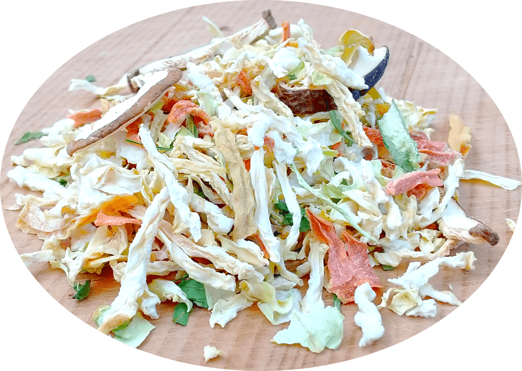 それは、おばあちゃんの1言でした。切干大根はなかと、1本買うと重いけん!確かに大根やキャベツなど1キロ、2キロ重量があるから沢山買えないよね!・・・まてよ!?乾燥すると重量が軽くなるし長期保存もできる!野菜の大きさ形は関係ない!味は変わらないのだから!!それから1年間かけて30種類以上の野菜を乾燥し試作と実験(乾燥時間、温度、湿度、含水率、カットサイズ)など試行錯誤を繰り返し生まれたのが九州七味野菜です。