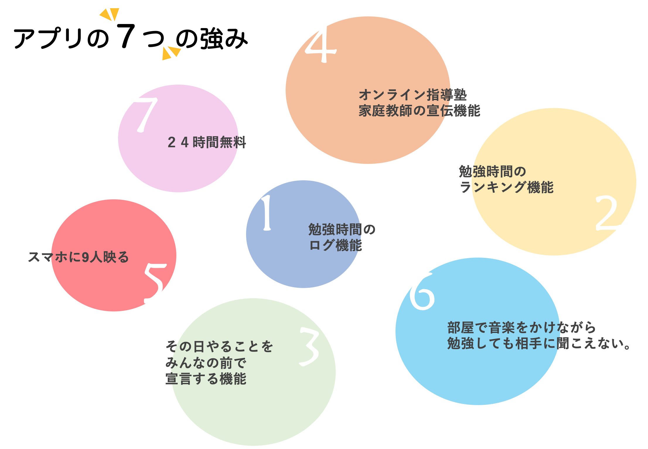 Web自習室アプリ「ミュート」では、以下の点で一般的なWeb自習室(=Zoom自習室)との差別化を図ります。