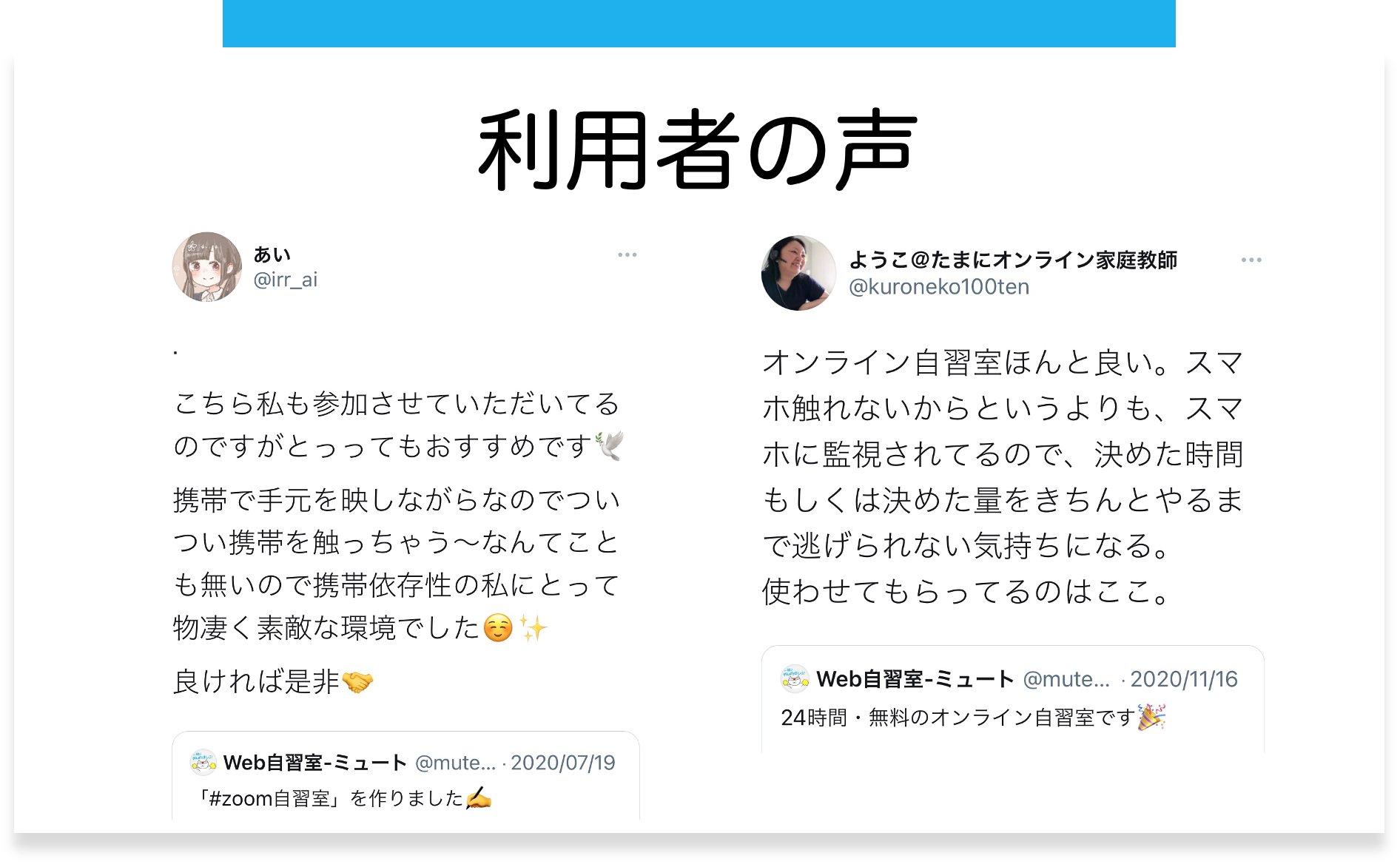 メンバーが7人から30人ぐらいまで増えた時に、同規模のWeb自習室コミュニティを見つけました。「Web自習室」は私が発明したと勘違いしていたのですが、実は既に存在していたのです。そのグループは「音声ありで時々雑談もしましょう」というスタイルだったので、「私達のグループは音声なしですよ」という説明の意味を込めて「ミュート」という名前をつけました。