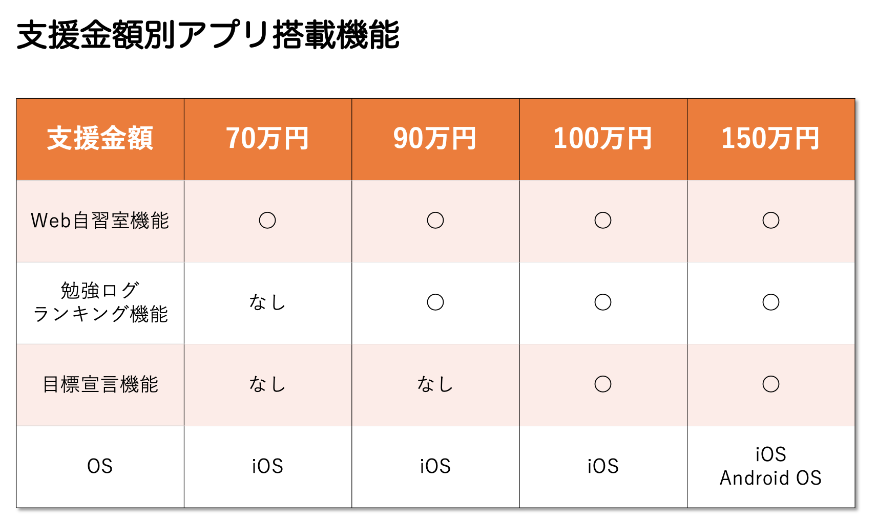 さらに90万円、100万円と支援金額が増えることで、勉強ログ・ランキング機能や、目標宣言機能が追加開発できます。