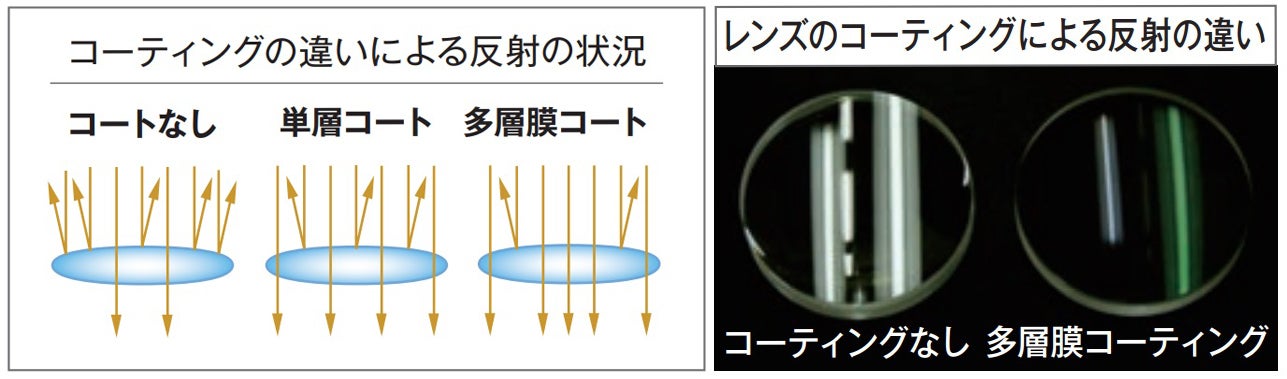 光がレンズを通る際、その表面と裏面で光の一部が反射します。それによって透過する光量が減少して像が暗くなるとともに、反射した光はフレアやゴーストとなって像のコントラストに悪影響を及ぼします。そこでSD60SS鏡筒では使用されている2枚のレンズの両面に、多層膜コート(マルチコート)を施すことで、できるだけ多くの光を透過させています。