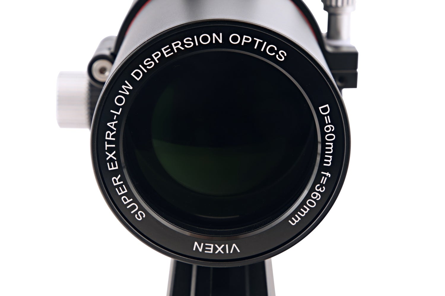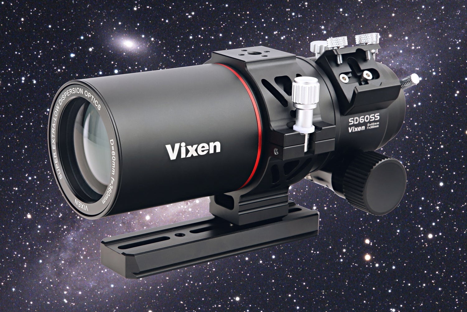 レンズで光を集める屈折式鏡筒では、光の波長(色)による屈折率の違いから「色収差」が起こります。ED(Extra Low Dispersion)(異常分散)ガラスを使用することで「色収差」を大幅に解消されます。SD60SS鏡筒においては、EDガラスの中でも特に優れた光学性能を発揮する素材「FPL53」を材料としたSD(Super ED)ガラスレンズを採用。これにより「色収差」を極めて高いレベルで抑え、星々の輝きをクリアかつシャープにとらえます。撮影においても安価な天体望遠鏡で撮影を行うと「色収差」が原因で星の色や月の周辺が紫色になってしまいます。