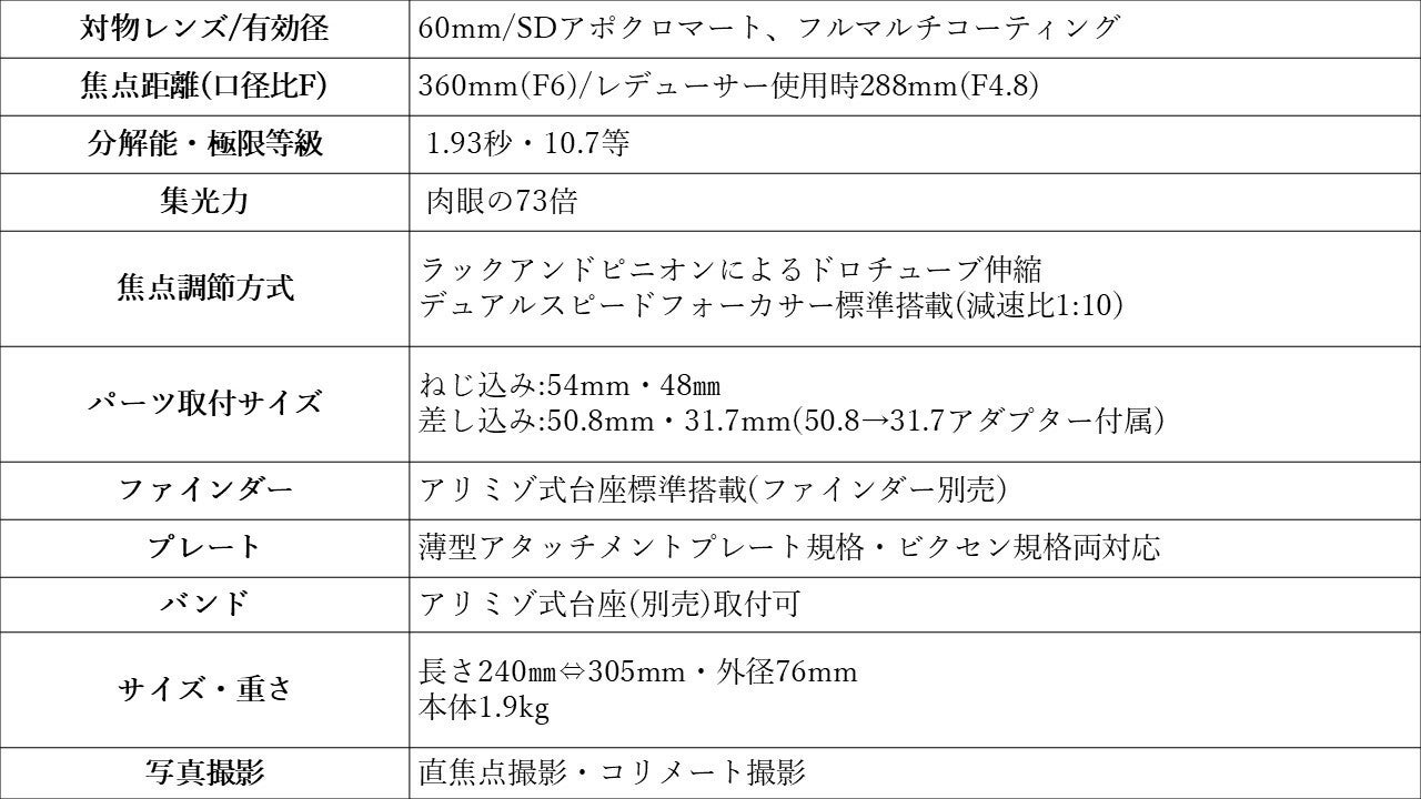 デュアルスピードフォーカサーが標準装備。粗動と微動(減速比約10:1)の2つのスピードでピント調整が可能です。天体写真撮影時や高倍率での観察時など、微細なピント合わせが必要とされる際に抜群の威力を発揮します。