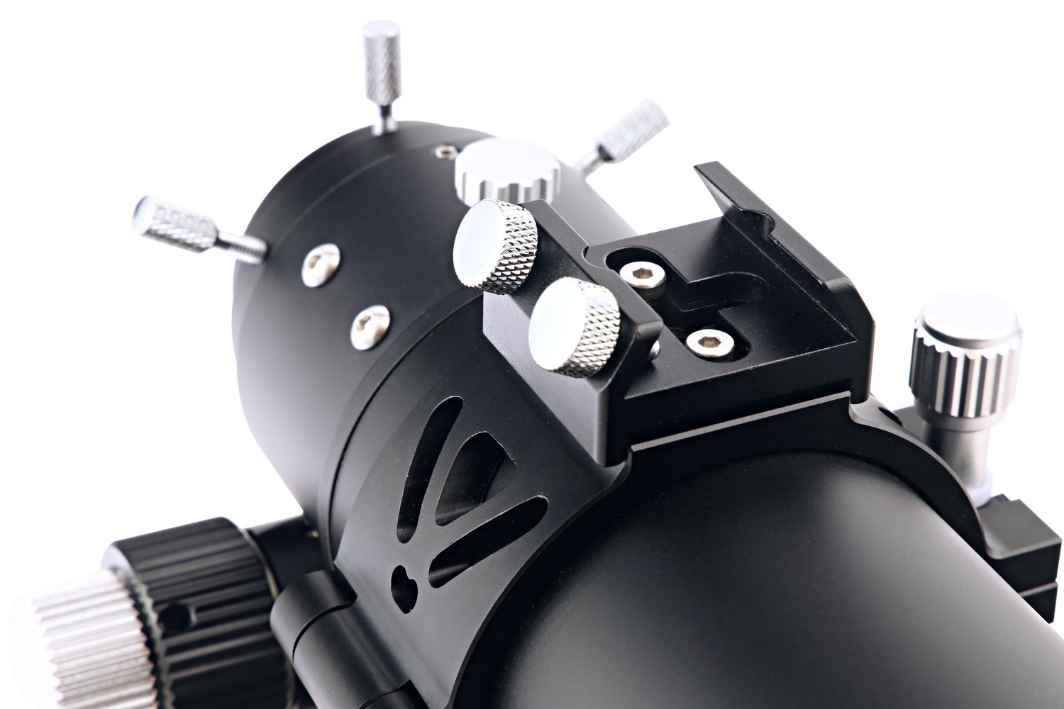 鏡筒バンド上部にはM4ネジ穴(4ヶ所)を装備しており、追加でファインダー脚台座(別売)を取付可能。付属のファインダー脚台座を付け替えることもできます。また、上部中央には3/8インチネジ穴を装備しています。