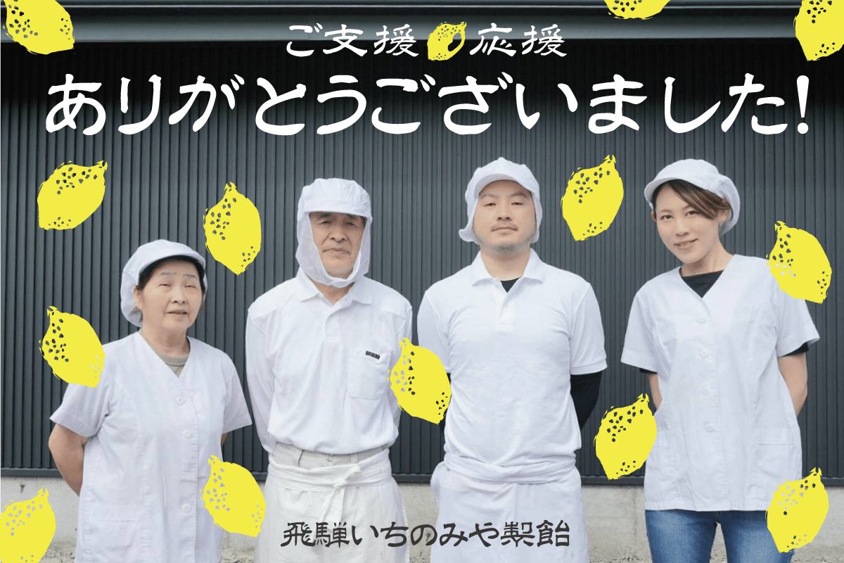 2021/07/27 08:00おはようございます!暑い日が続いたかと思えば今日から台風の予報ですね。関東や東北にお住まいのみなさん、どうか安全にお過ごしくださいね。さて、今月3日からスタートさせた、クラウドファンディングですが無事昨夜終了しました!『激すっぱレモン飴』をご支援いただき、本当にありがとうございました。ネクストゴールには届きませんでしたが、179%の達成率、そして108人もの方からご支援いただけたこと、本当に本当に喜びでいっぱいです。みなさんからの応援のコメントを読むたびに飴作りへの思いや、2代目のすっぱいものが大好きだ!というこだわりに共感していただけたことを実感し、とても胸が熱くなりました。リターンの『激すっぱレモン飴』は8月中旬頃にみなさんにお届けできるよう、現在大急ぎで準備を進めておりますので、もうしばらくお待ちくださいませ。発送の準備が完了したら、またご連絡させていただきます(˘⌣˘)※オリンピックの関係で交通規制があるため、お届けまでに少し時間がかかってしまう恐れがあります。早くお届けできるよう早めの出荷を心がけておりますがご理解いただけましたら幸いです。まだまだ続く、暑い夏。『激すっぱレモン飴』がそんな夏のお供になれれば嬉しい限りです。改めて、今回のクラウドファンディングをご支援いただき、そして約1ヶ月に渡りお付き合いいただき本当にありがとうございました。これからも飛騨いちのみや製飴では美味しく楽しい飴作り、そして新しい挑戦を続けていきますので、引き続き応援のほどどうぞ宜しくお願いいたします。飛騨いちのみや製飴一同より心からの感謝を込めて もっと見る