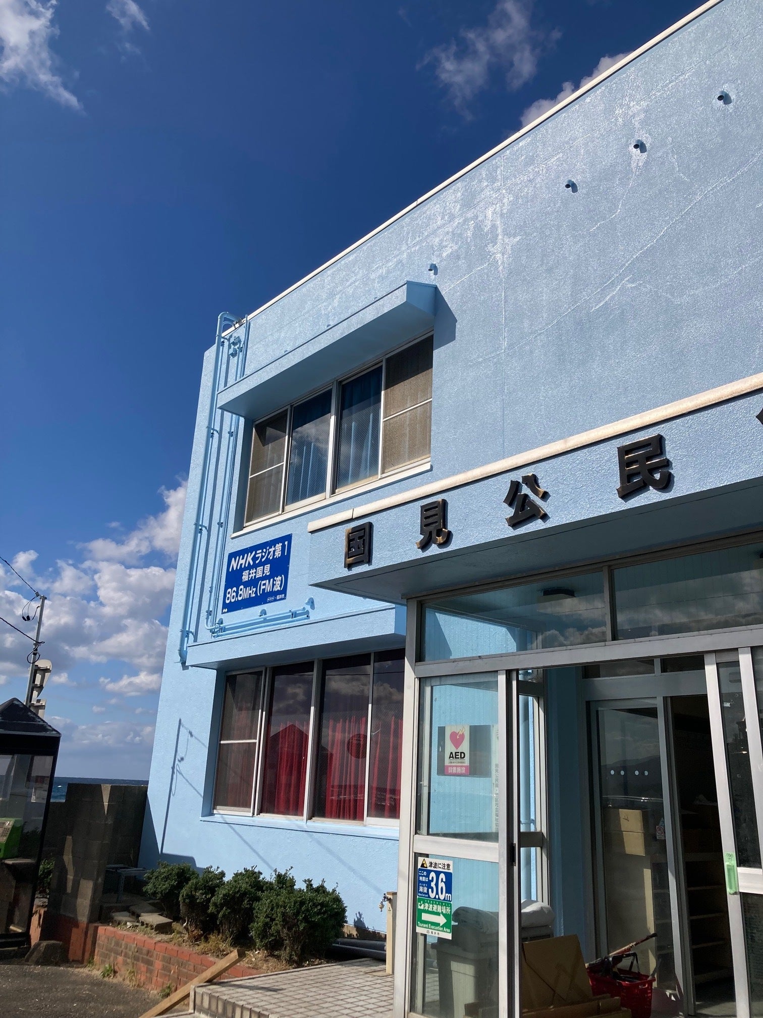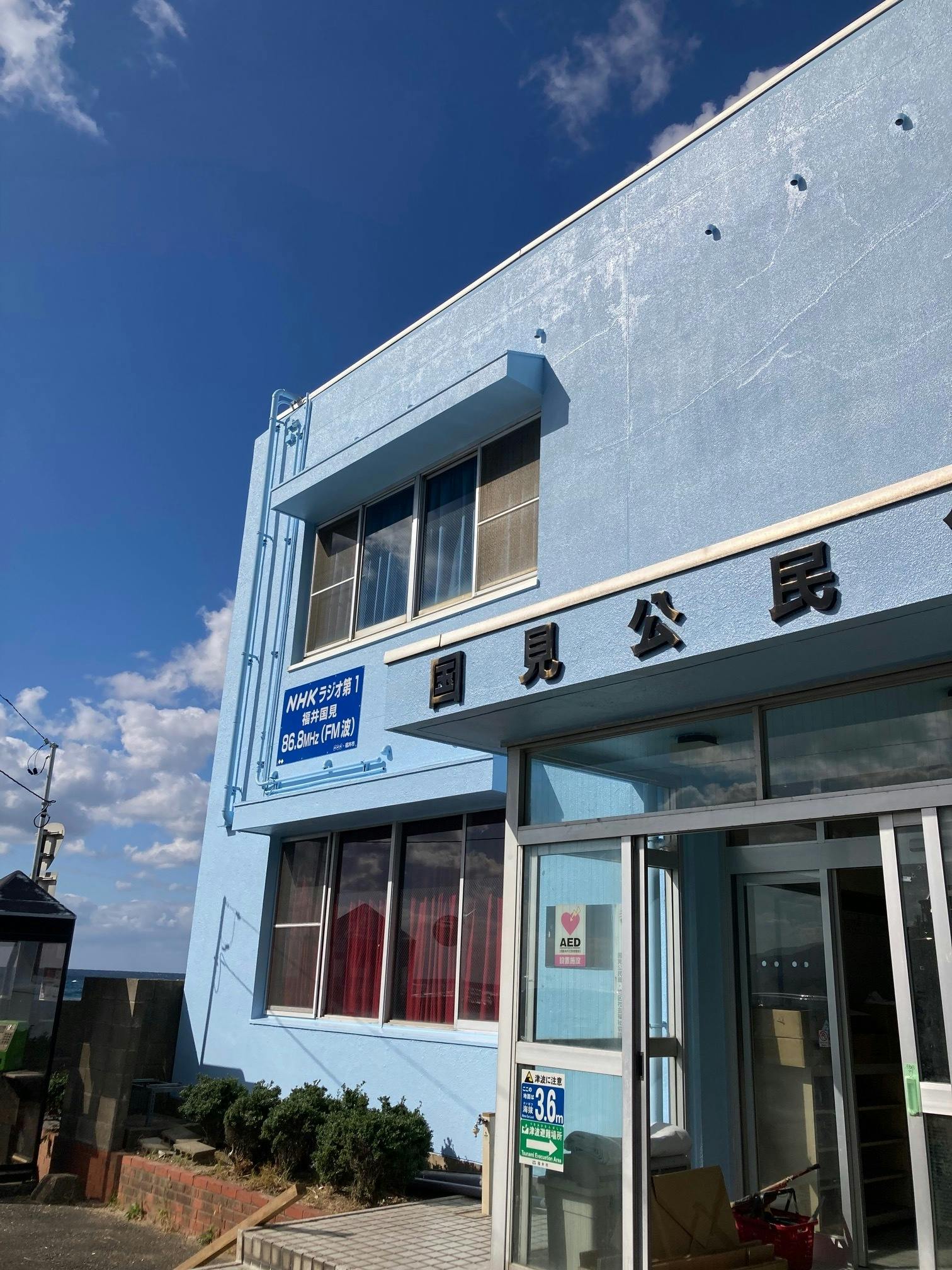 くにみクラゲ公民館(写真中央右の白い建物)も海が目と鼻の先