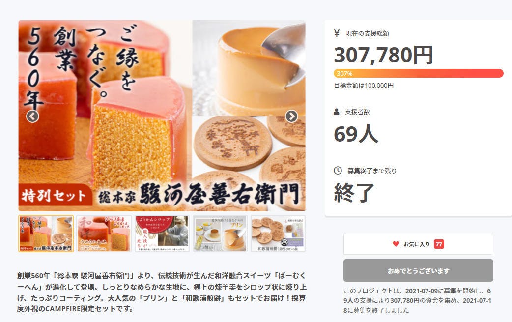 2021/07/19 14:047月18日をもちまして、総本家駿河屋善右衛門のクラウドファンディングの応募期間が終了しました。7月9日から始まり短い間の期間ではございましたが、当初の目標より多くのご支援がいただけたこと感謝しかございません。不安ながら始めた挑戦でしたが「楽しみ!」「駿河屋の商品が好きです」とあたたかいコメントをたくさん頂き、SNSからもご支援してしていただくなど多くのご縁を感じることができました。今回ご支援頂いた方々やSNS等で応援してくださった皆様の言葉を励みにこれからも新たな歴史をつなぎ、たくさんの笑顔を作れるよう精進してまいります。たくさんのご縁をありがとうございました。「感動の和洋融合スイーツ、総本家駿河屋善右衛門 の「ばーむくーへん」セット」プロジェクトスタッフ一同 もっと見る