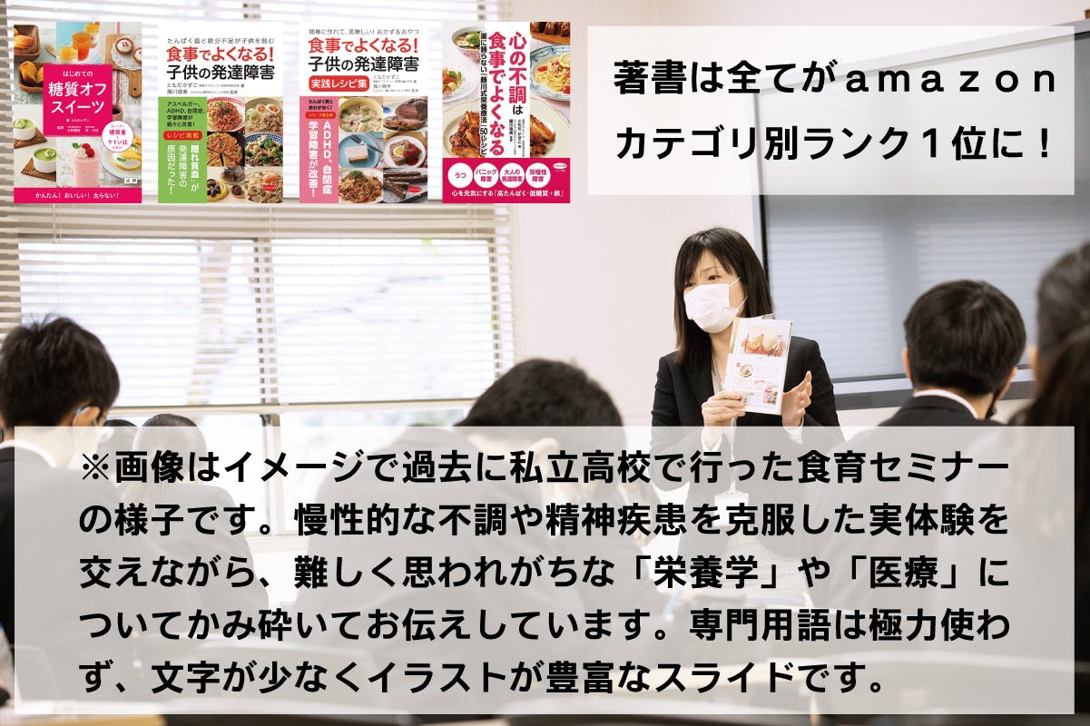これまで出版したレシピ本や家庭医学本は4冊ありますが、「食事でよくなる!子供の発達障害/マキノ出版」はamazon「本の総合ランク」で最高20位(※2019年2月24日集計)、累計発行部数26,000部(2021年7月時点)のヒットとなりました。
