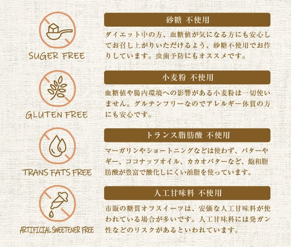 Low Carb Houseの糖質オフスイーツは、砂糖・小麦粉・トランス脂肪酸・人工甘味料不使用。