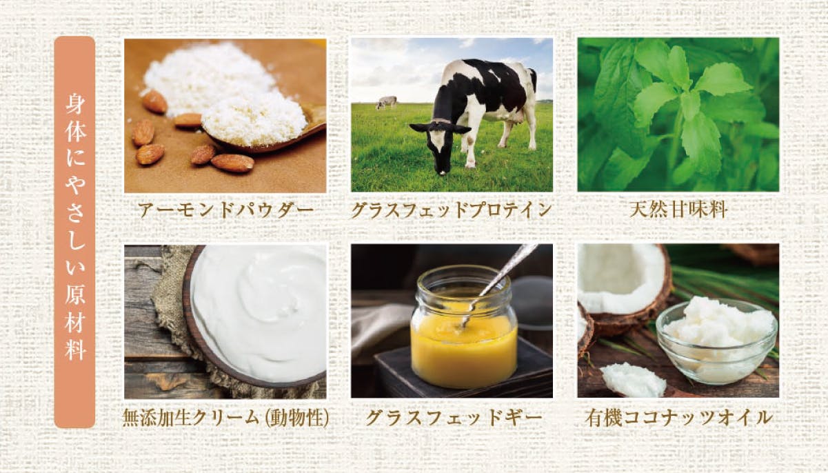ビタミンEが豊富なアーモンドパウダー、放牧牛由来のグラスフェッドプロテイン、エリスリトールやステビアなどの天然由来甘味料、無添加生クリームなどを使い、美味しさと安心を追求した「心と身体に優しい糖質オフスイーツ」です!!
