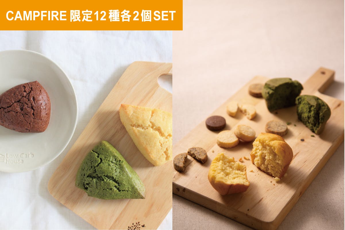 ネット未発売品のプロテインスコーン3種(カカオ・ココナッツ・抹茶)を含む合計12種のスイーツを各2個ずつ詰め合わせたCAMPFIRE限定セットです☆