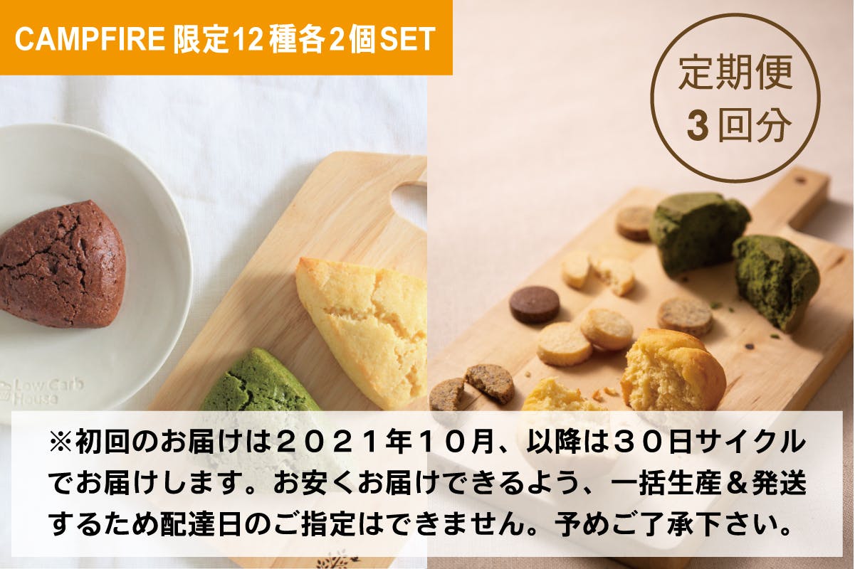 ネット未発売品のプロテインスコーン3種(カカオ・ココナッツ・抹茶)を含む合計12種のスイーツを各2個ずつ詰め合わせたCAMPFIRE 限定セットを30日サイクルで3回お届けします!!
