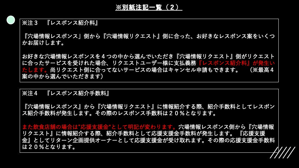 キャンセル申請から24時間経過されても応答、対応がない場合自動キャンセルとなります。「穴場情報レスポンス」と「穴場情報リクエスト」が規約に同意いして入金した際には返金などいっさい出来ません。