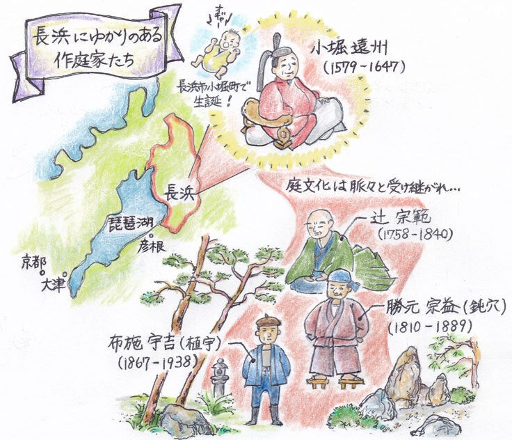 日本を代表する文化人として知られる小堀遠州は長浜で誕生しました。市内に彼自身の作庭はないものの、遠州から始まったお庭文化は脈々と弟子たちに受け継がれてきました。遠州流茶道を「返り伝授」(遠州の子孫に遠州流茶道を教える)したことで知られる辻宗範、その弟子で、500以上もの名庭を手掛けた勝元宗益(鈍穴)、宗益の影響を強くうけて近代に活躍した布施宇吉(植宇)らがいて、長浜は庭師のふるさとだとも言われています。私たちが先に発行した小冊子に掲載した庭のほとんどが、こうした先人たちの流れを汲んでいます。