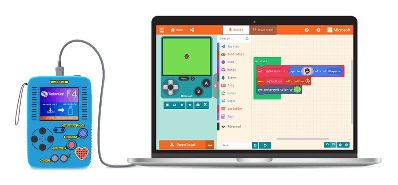 MakeCode Arcadeは、独自のゲームをシミュレートするための人気のあるプラットフォームです。Webブラウザーを介して簡単に使用でき、コードをダウンロードしてGameGoで楽しむことができます。 USBケーブルを使用してGameGoをコンピューターに接続するときは、GameGoの上部にある電源スイッチを押します。画面にはTinkerGen F4アイコンが表示され、その後GameGoにプログラムをダウンロードすることができます。