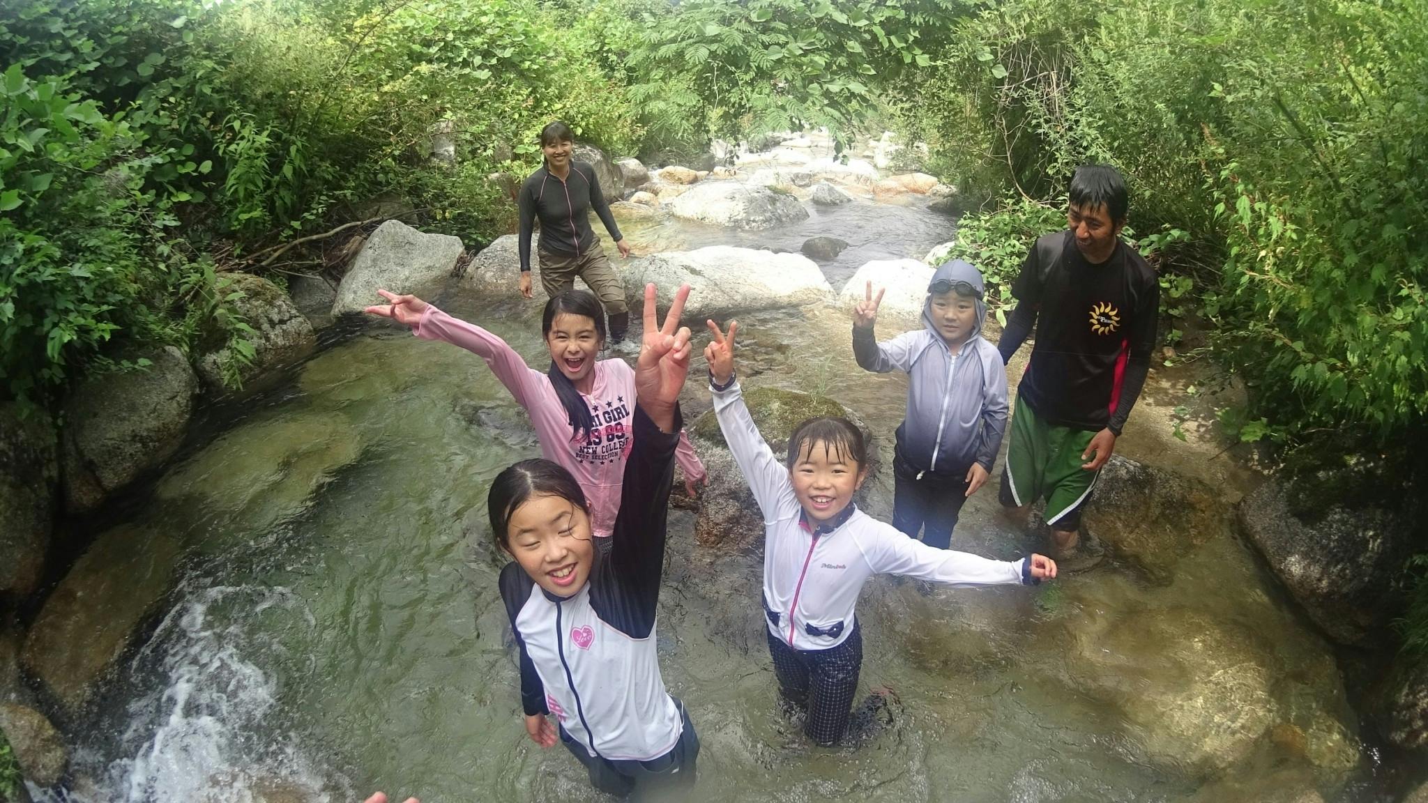 川に足を入れたり、潜ってみたりすることで遊びの楽しさを実感。みんな最後は笑顔でポーズ。普段笑顔になれない子供でも、川遊びを通じて自然と笑みを見せてくれるようになります。