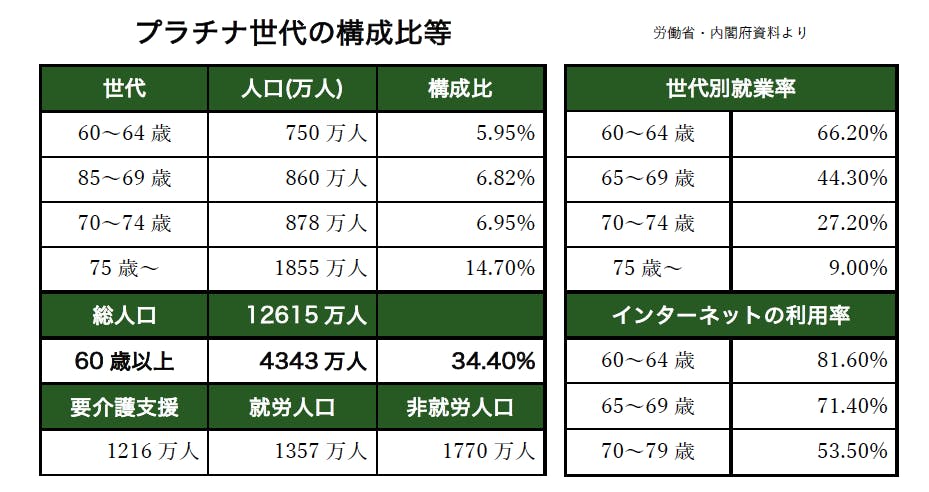 60歳以上のプラチナ世代の人口は総務省の統計で見ると4350万人(総人口比34.4%) 、次世代となるプラチナ世代予備軍の50歳代1630万人を加えると5980万人、総人口比47.4%となります。