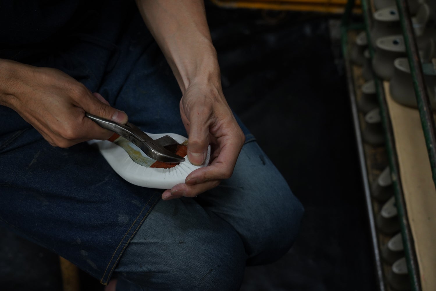通常靴作りにはトーラスターというつり込みの機械を使いますが、この靴には使いません。