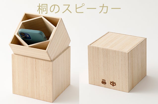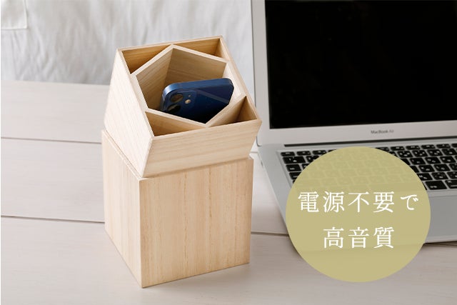 音楽を再生したスマートフォンや音楽プレイヤーを桐スピーカーの中に入れると、音が反響する効果が。