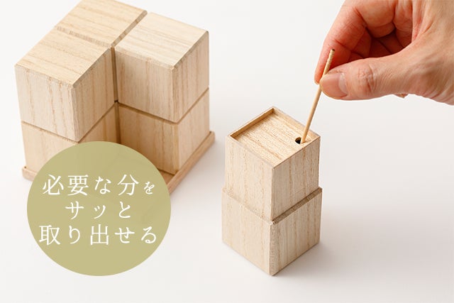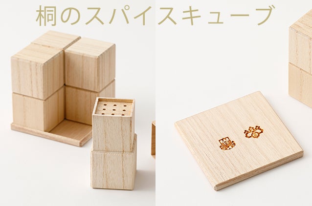 9個穴のスパイスケース×3、爪楊枝ケース×1がセットになったスパイスキューブです。桐の特性によって、湿気や虫から中身を守り、保存性をキープ!