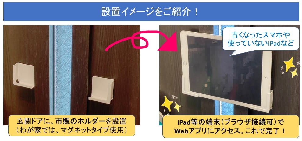 スマホ(iPad)を玄関ドアなどに設置するだけで、手軽に利用ができます。(別途、市販のホルダー等が必要になります。)