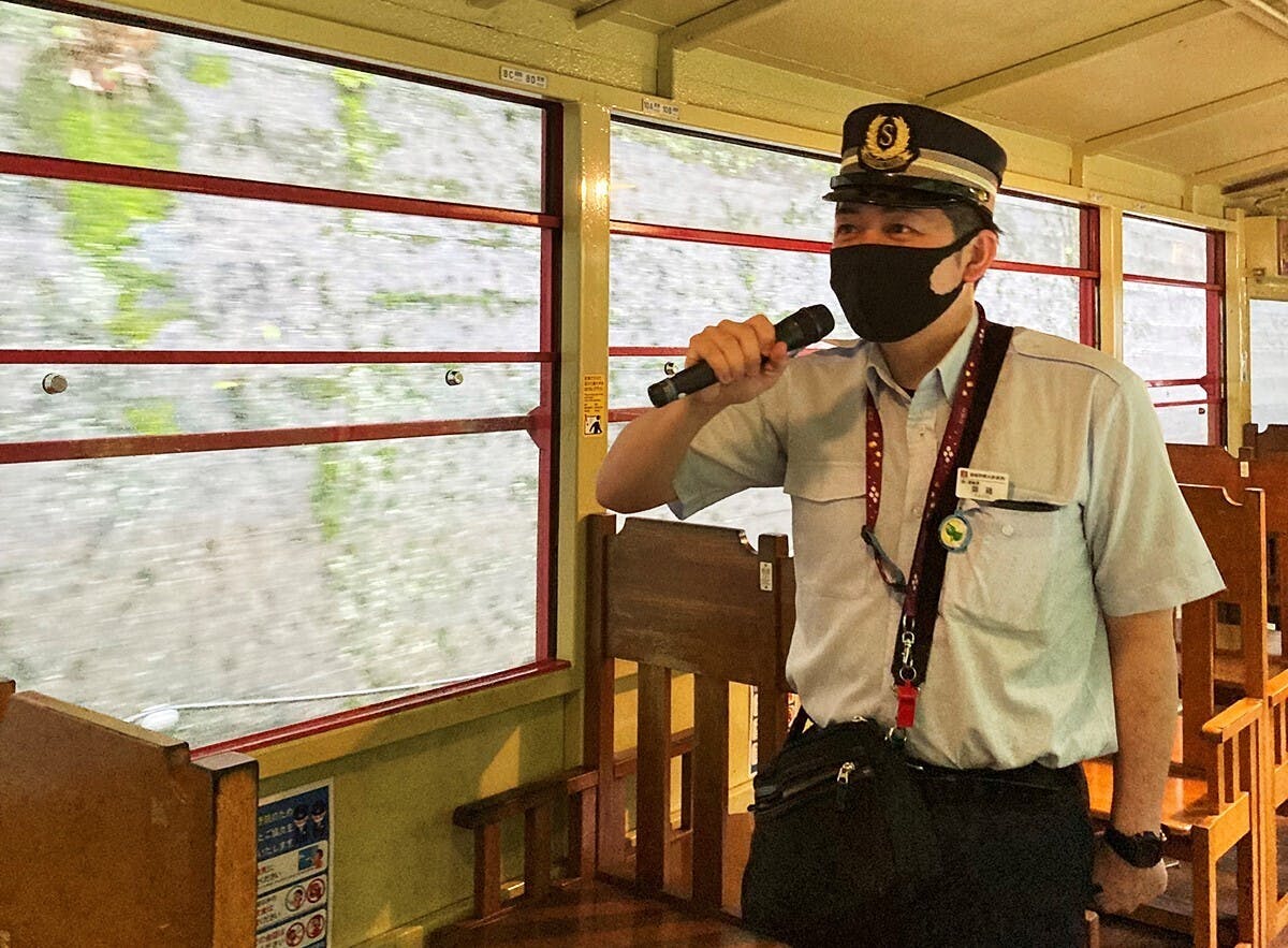 多くのお客様にお楽しみいただけるよう、車内では車掌が沿線の見どころを余すところなくお伝えします。また、保津川の歴史や自然について等、車掌によって異なるエピソードをご用意しております。運が良ければ歌の上手な車掌の生歌が聞けるかも!?