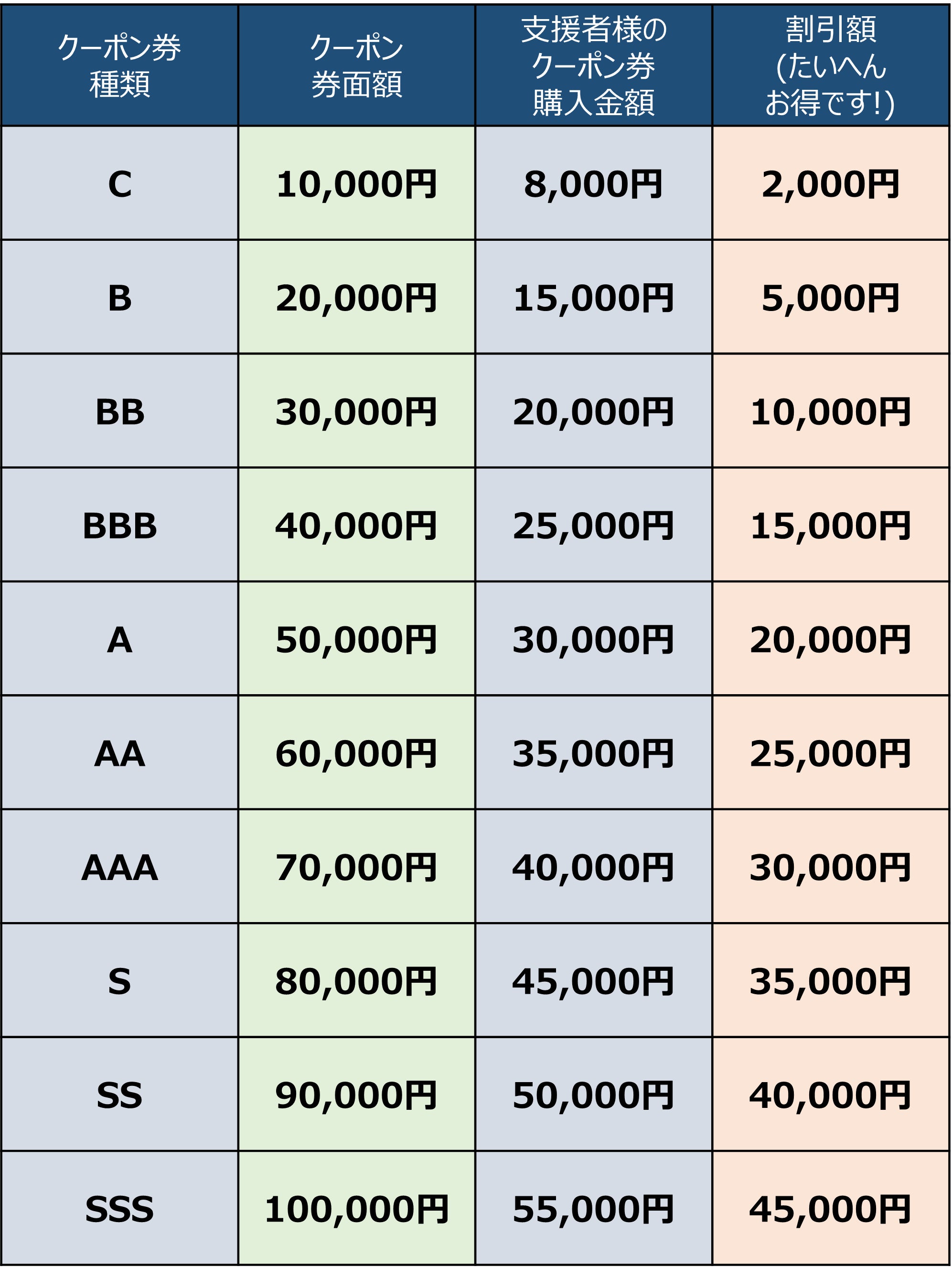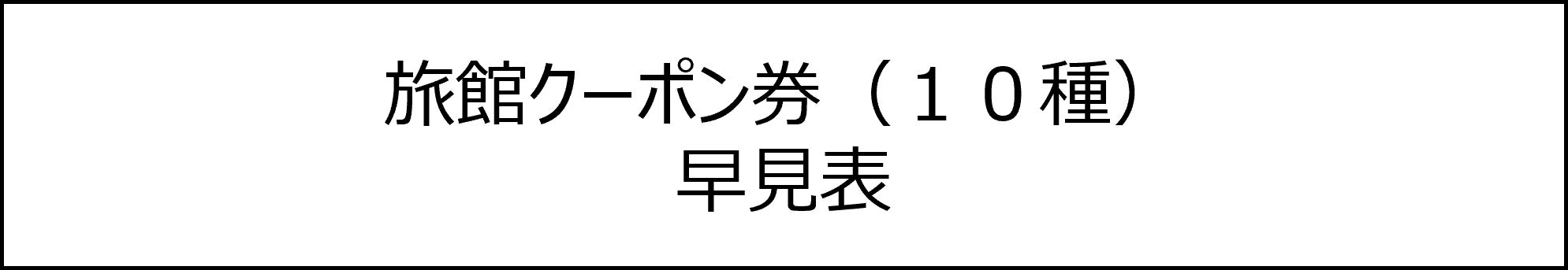 10種類のクーポン券の早見表です。本クラウドファンディングのための価格で、大変お得なクーポン券となっております。一人でも多くの支援者様にクーポン券をご購入いただき、支援先対象旅館様に滞在していただきたいと考えております。是非、ご支援を検討ください。