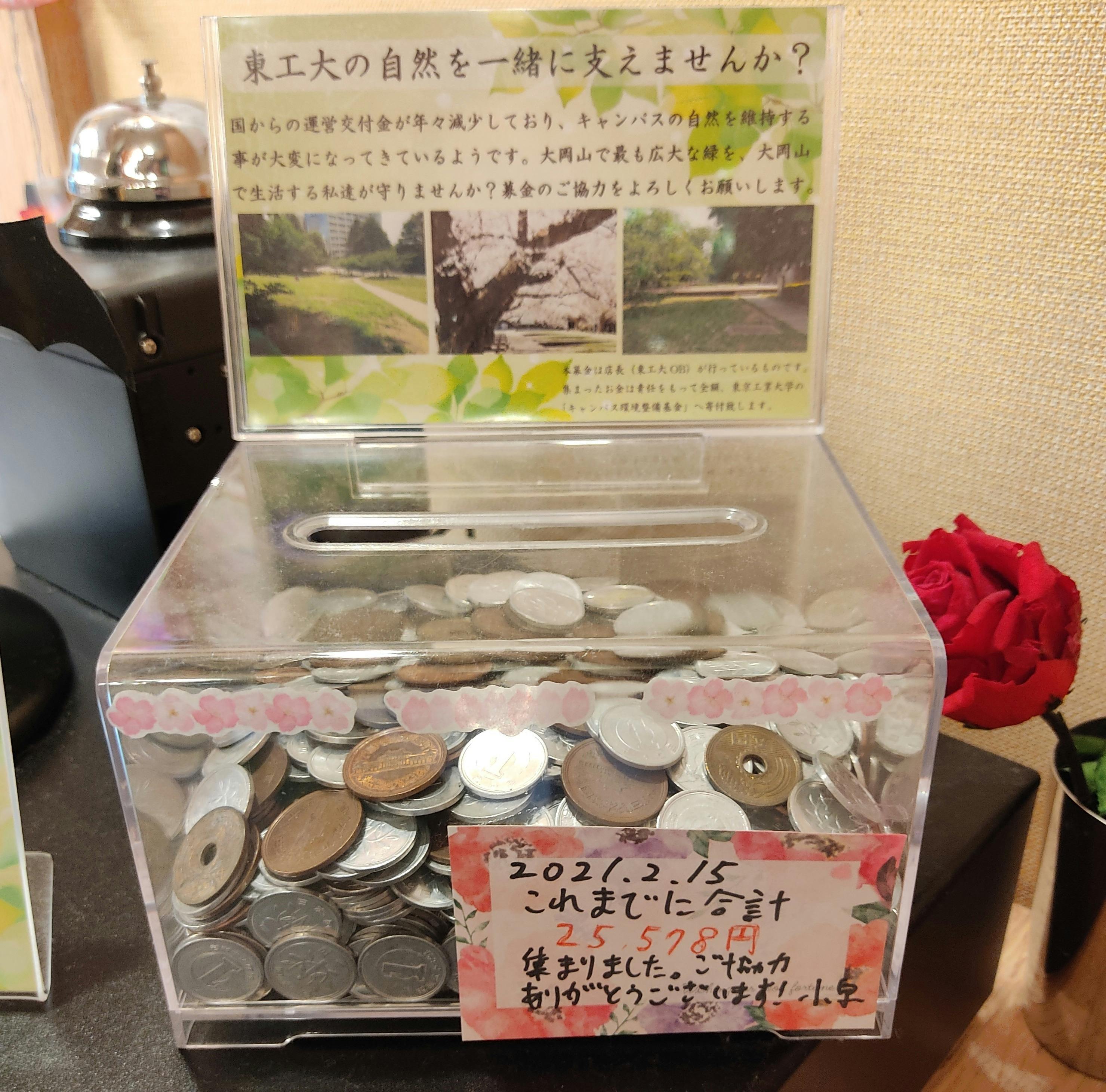 2021/09/29 08:08おはようございます。いよいよ本日が最終日となりました。目標達成は難しいですが、多くの方々にご覧頂き、支援して頂けた事嬉しく思います。このクラウドファンディングに続いて、これからも広く知ってもらえるように頑張りたいと思います!お店の近くにある東京工業大学は私の母校でもありますが、最近は国からの交付金が減っており、様々な面で金策に苦労しているそうです。その一つが広大な緑地の維持だそうです。東工大は東京ドーム5個分以上の広さがあり、建物の無い敷地部分には緑も多く、近隣では最も大きい緑地でもあり散歩や憩いの場にもなっています。立派な桜並木もあり、春はお花見も楽しめます。そんな緑地も維持費が膨大らしく、OBに募金のお願いが来ています。そこで当店では東工大を利用する大岡山の住民にも緑地維持に協力してもらおうと募金箱を設置しています。これまでに集まった金額は微々たる額かもしれませんが、近隣の方々に関心を持って頂く機会になりました!中には近所の方で毎回のように募金に協力してくれる方も何人かいます。店頭で募金活動を始めて2年位経ちますが、これからも、お世話になった母校のため、近場で自然を楽しめるため…地道に活動は継続したいと思います。この記事を投稿後、私自身も再び募金したいと思います!! もっと見る【残り1日!】実はティーフルのハーブティーは店長オリジナルブレンド!