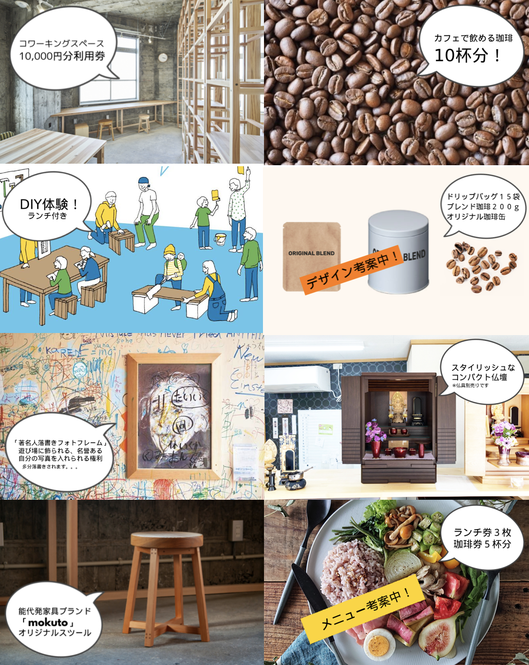 返礼品には主にカフェで取り扱うものをご用意しました。私自ら焙煎したオリジナルのブレンドコーヒー券や只今検討中のランチ券、珈琲を保管する缶やDIY体験、そして仏壇!など多種ご用意いたしました。