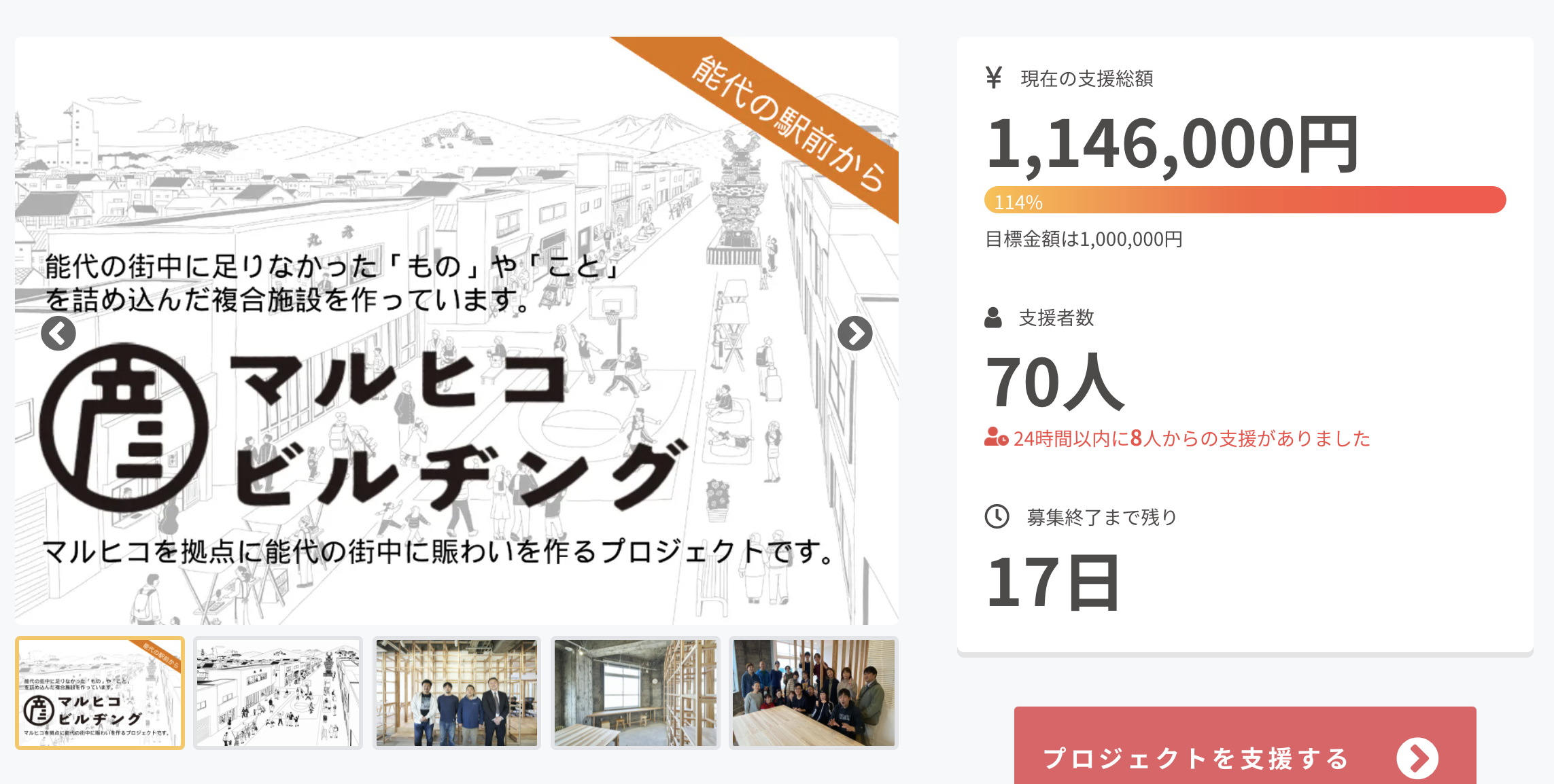 2021/11/04 10:11目標達成しました!!ご支援頂いた皆様本当にありがとうございます。この1週間は本当に充実した日々でした。昨日イベントが終わり疲れがどっと出て、いつの間にか眠りについてて、起きたらびっくり目標達成!なんとも心臓にわるい嬉しい寝起きでした(笑)ちょっとだけイベントへの想いを。能代駅前商店会でお祭りが最近行われてなかった事もありますが、能代市の一大イベントであった「おなごりフェスティバル」も昨年度で終わりを告げ、活気が失われかけていました。そこで昨年、駅前商店会とのしろ家守舎が連携して新しいイベントを始動させました。それが昨年9月13日に開催した「第0回目のしろいち」でした。のしろ家守舎もまだ会社設立前という事と、コロナ禍の中での手探りイベントだった為、0回と位置付けました。ある意味予行練習。中心市街地に子供や大人の姿を日常的に作りたい!と活動しているものの、用事がないと来ないですよね。スタートはそこからでした。商店会の各個店の魅力を知ってもらって、楽しそうな街だなと思ってもらえるところから。地道な計画です。その後も、ウィズコロナ、アフターコロナを踏まえた歩道活用の実証実験でもある「だん・だんのしろ」など能代市だけではなく、秋田県の協力もあり賑わいを作る努力を重ねてきました。そして満を持して開催されたのが「第1回目のしろいち」です。同時期に能代市で種苗交換会が開催されているという事もあり、のしろいちの実行委員メンバーも企画段階からテンションが高く、歩道活用では満足いかないという事で車道も止めちゃうこととなります。おなごりフェスティバル以外では車道を止めたイベントの記憶は私にはありませんでした。聞くところ30年前くらい前はかなり歩行者天国イベントを行っていたとか?おかげさまで大成功のイベントとなりました。(集客10000人オーバーとか)なにも無いと感じていた商店街に、そして無駄に広いだけと言われてた車道・歩道にたくさんのお客さん。子供からおじいちゃんおばあちゃんまで、笑顔で溢れる空間になりました。視点を変え、今の時代に合った使い方をする事で新しい価値を生んだのだと思います。子供達にもちょっとは面白い街だなと感じてもらえたはずです。これからの課題としては単発イベントにならないような仕組みづくりが必要だと思っています。大きなイベントほど疲弊していくので、無理なく日常化できる仕組みづくり。空き店舗活用、新規起業者の呼び込みも同時進行で行なっていく仕組みづくりです。「第0回目のしろいち」「だん・だんのしろ」そして「第1回のしろいち」一気にどーんと来た感じもしますが、みなさんの笑顔を見てたら嬉しくなりました。今回はコロナもだいぶ収束して開催する事で開催出来ましたが、これからも気を抜かずチャレンジしていきたいと思います。能代出身者さんや繋がりのある方にもこの活動の事を知って欲しい欲しいと思っています。長くなりましたが、皆様のご支援のおかげでまだ期日残しながらも目標の100万円に到達しました。本当にありがとうございます。まだ期間がありますので、もっとたくさんの方々に想いを届けて追加ご支援頂けたらと思っています。DIYで作る部分に関しては今回のゴールで行う事ができる事になりました。この後のご支援で遊び場の充実や、カフェ機能やKILTAのしろの充実をはかり、日常的に賑わいを作る拠点を作っていきます。今後とも引き続きよろしくお願いします。合同会社のしろ家守舎 一同より もっと見る