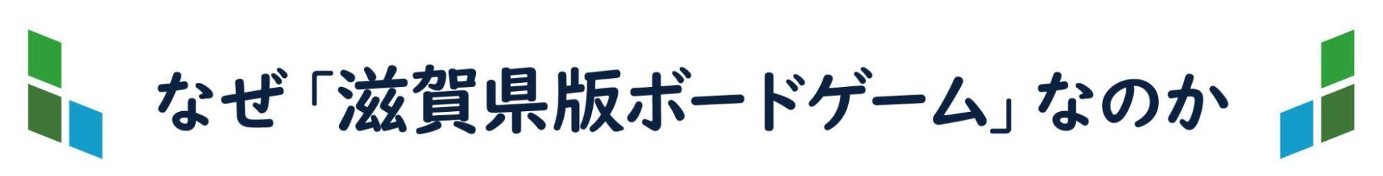 そんな滋賀県から「地方」「企業」「SDGs」の発信を目指して、身近な事例を題材に展開したいという関係者の熱い思いの詰まったボードゲームを、SDGsボードゲームふるさと版の第一号として制作しました。