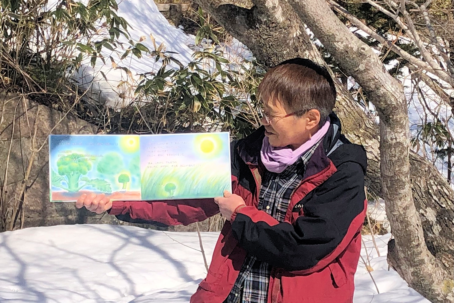 「函館絵本の会 銀のふね」の岸本和子さんが、函館山歩きイベントの休憩時間に、ご参加の皆様に向けて、「だつブロくん」絵本を読み聞かせにお使いいただきました。