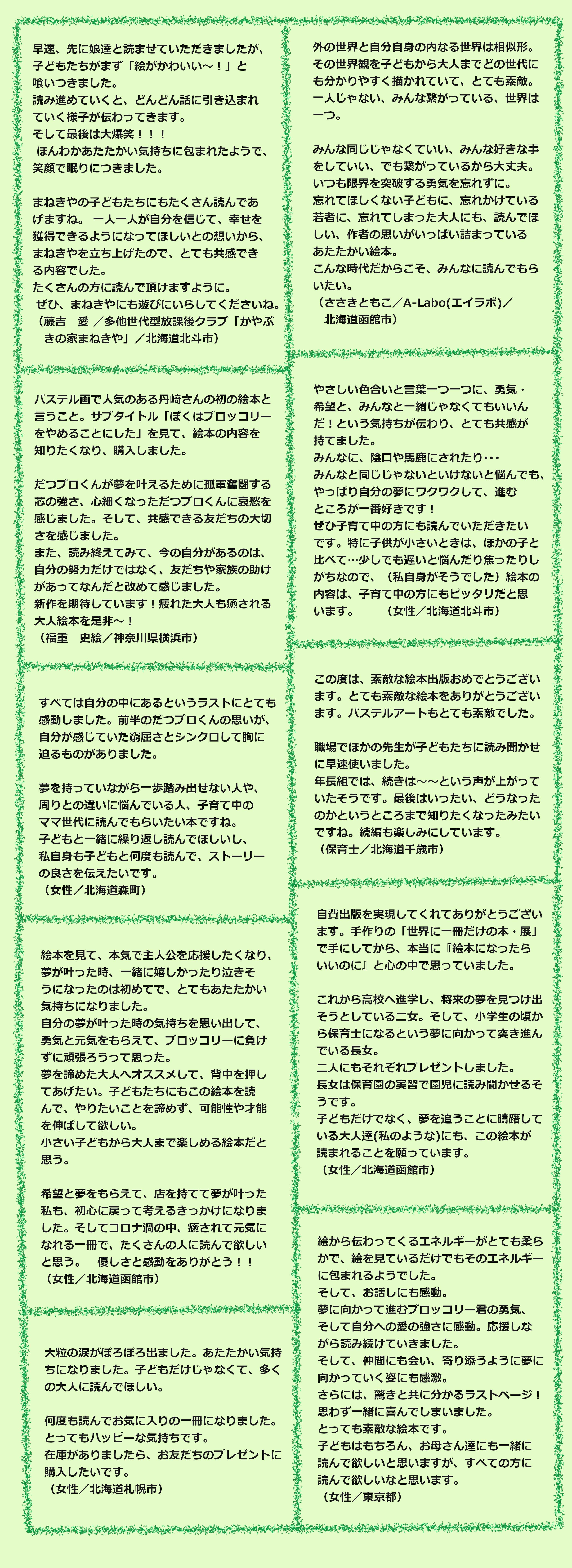2022/02/10 16:19こんにちは『北海道の図書館に届けたい! 大人にも勇気を与えてくれるブロッコリーの絵本』”だつブロくん”寄贈プロジェクトオーナーの丹﨑真由子です。先日2月4日、寄贈先として追加いたしました北海道渡島管内の小学校へ”だつブロくん絵本”を発送し、寄贈を無事終えることができました。 渡島管内は、函館市、北斗市、七飯町、鹿部町、森町、八雲町、長万部町、木古内町、知内町、福島町、松前町の11市町村の公立小学校、私立小学校、附属小学校の 89校に寄贈させていただきました。絵本到着後、書面やメッセージでお礼状をお送りいただいた教育委員会様もあり、たいへんお喜びいただいているようです!!各市町村の小学校へ配布され、児童の皆さんや学校の先生方にもお読みいただけるのが今からとっても楽しみです。そして本日、”北海道大沼国際セミナーハウス”様にも寄贈させていただきましたことをご報告させていただきます。北海道大沼国際セミナーハウス様は、四季折々で散策を楽しまれたりコワーキングスペースを利用してお仕事や勉強しに訪れたり、様々なイベントが催されたり、子育て支援施設の方が利用者さん達と遊びに来られたりと、所在地である七飯町内外から、様々な方が訪れる自然豊かな施設です。私自身も本業のパステルアートの個展で、昨年大変ご厚意にしていただきお世話になりました。こちらの施設にあるコワーキングスペース“ホワイエ”には、絵本もたくさん置いてあり、”だつブロくん”もそのお仲間入させていただけることとなり、とても嬉しく思っています。セミナーハウスに足を運ばれましたら、ぜひ”だつブロくん”を見つけくださいね!また、函館新聞社様に先月森町立図書館に寄贈に伺った際に取材をしていただきました。先日6日に、記事として掲載をして頂きましたので、併せてご報告させていただきます。さて、”だつブロくん”絵本は、北海道内の図書館、渡島管内の小学校、森町内とその他寄贈先を合わせて合計217カ所への寄贈させていただき、すべての寄贈を無事に終えることがでました。それぞれの寄贈先で、お子様から大人まで、多くの方にお楽しみいただき、コロナ禍の生きづらい世の中だけれど、心の声に耳を傾けて、一度きりの人生をあなたらしく生きて欲しい。あなたは決して一人じゃない。世界中で唯一無二のあなたという存在を、まずはあなた自身が愛して大切にして欲しい。そのような思いを込めて制作したこの”だつブロくん”絵本が、心をふわっと軽くする時間になったり、小さくても、心に灯をともすきっかけとなりましたら嬉しいです。最後になりましたが、寄贈を快く受け容れていただいた北海道内の図書館、社会教育後関係者の皆様、渡島管内小学校、学校教育関係者の皆様、森町内の教育保育等各施設の皆様、その他寄贈について関わっていただいた皆様、本当にありがとうございました!!そして、このプロジェクトにご賛同いただき、お力添えをしていただいた皆様に、改めまして、心より感謝申し上げます。だつブロくんが、”なないろに輝く空”を大切な仲間と一緒に観ることが出来たように、私も、ご関係者の皆様と一緒に”夢”を叶えることができました!!本当に、本当にありがとうございました!!今後もこのプロジェクトと繋がりのある動きなどがございましたら、改めてご報告させていただきます!!丹﨑 真由子 もっと見る