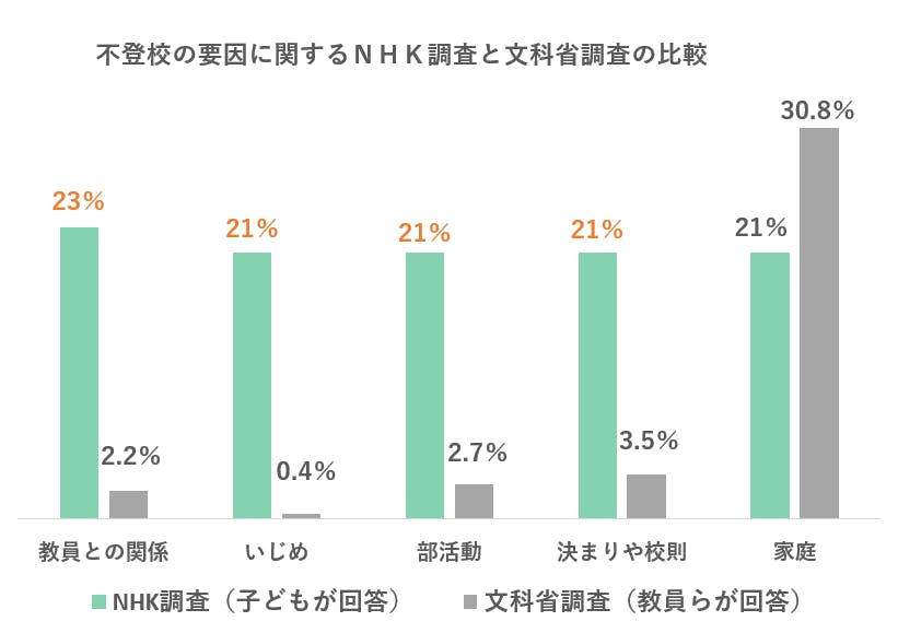 こちらの調査結果だけをみると、1位は「無気力、不安」。2位は「いじめを除く友人関係」、3位は「家庭問題」となっています。しかし、2019年5月にNHKが不登校・不登校傾向のある中学生にアンケート調査を実施したところ、上図の文部科学省の調査結果と大きな食い違いが出てきました。